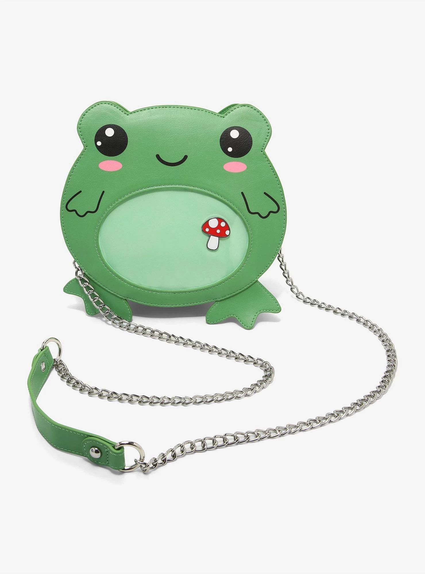 Hop around town while showing off all your favorite pins! This crossbody bag is shaped like a kawaii frog, and features a pin display window on its tummy. Comes with an interior drop pocket, chain crossbody strap and top zipper closure. Plus, it includes a cute mushroom enamel pin to get you started!