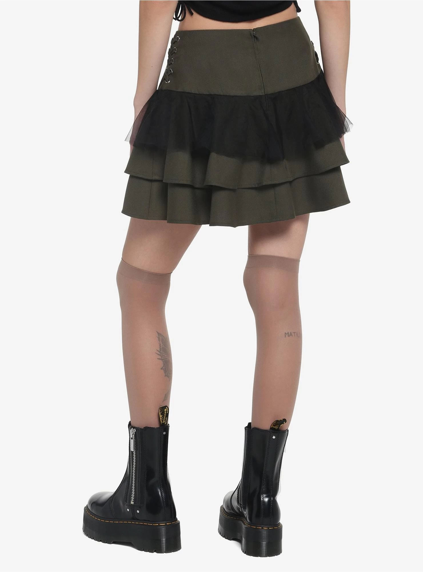 Grunge, but make it cute. This olive, tiered skirt features a black tutu layer, plus lace-up detailing on the sides. Complete with grommet strap accents and a back zipper closure.
