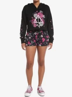 Track down some Horcruxes with a comfy hoodie on! This Harry Potter cropped hoodie comes in a relaxed fit and features a central print of the Deathly Hallows symbol with dark flowers all around, plus wands on the sleeves wrapped in vines. Comes with henley-style buttons down the center chest and a hood. Pair with the matching lounge shorts to complete your magical look!