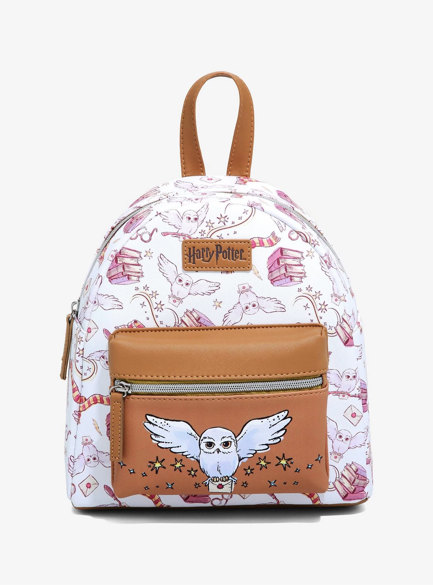 At last: Your owl is here with your Hogwarts acceptance letter! This mini backpack from Harry Potter features Hedwig with letter in tow on the front zipper pocket and a watercolor toss print pattern of owls, scarves and books on the body of the bag. Adjustable straps and silver tone hardware.