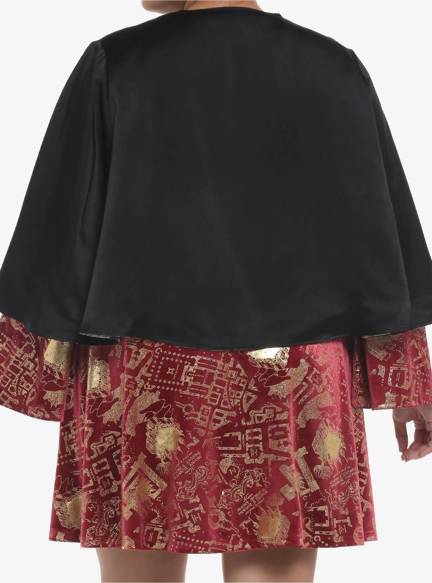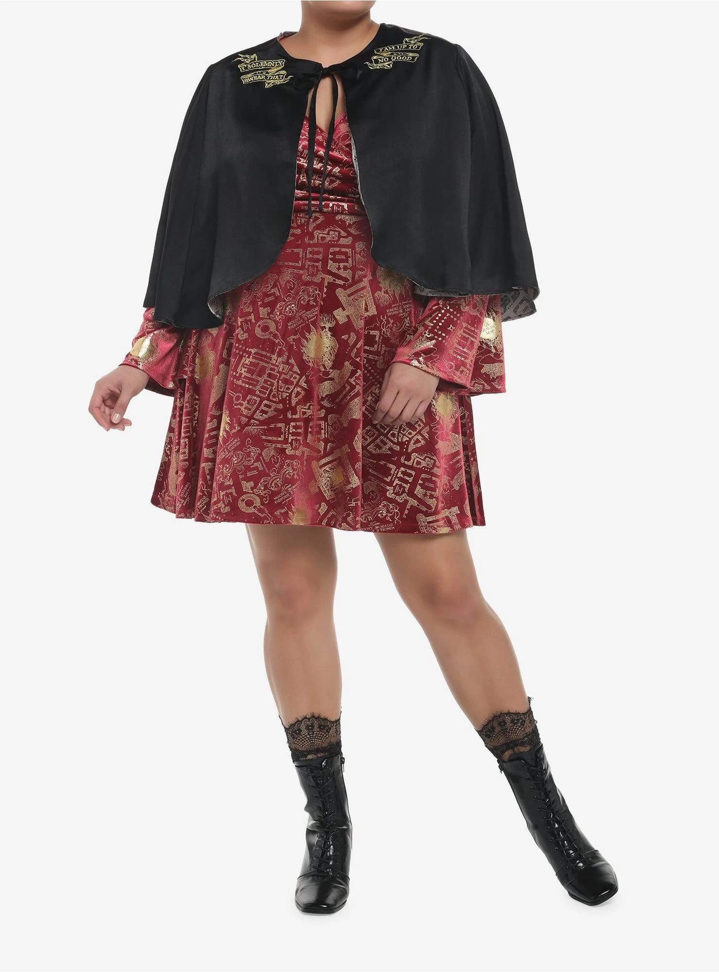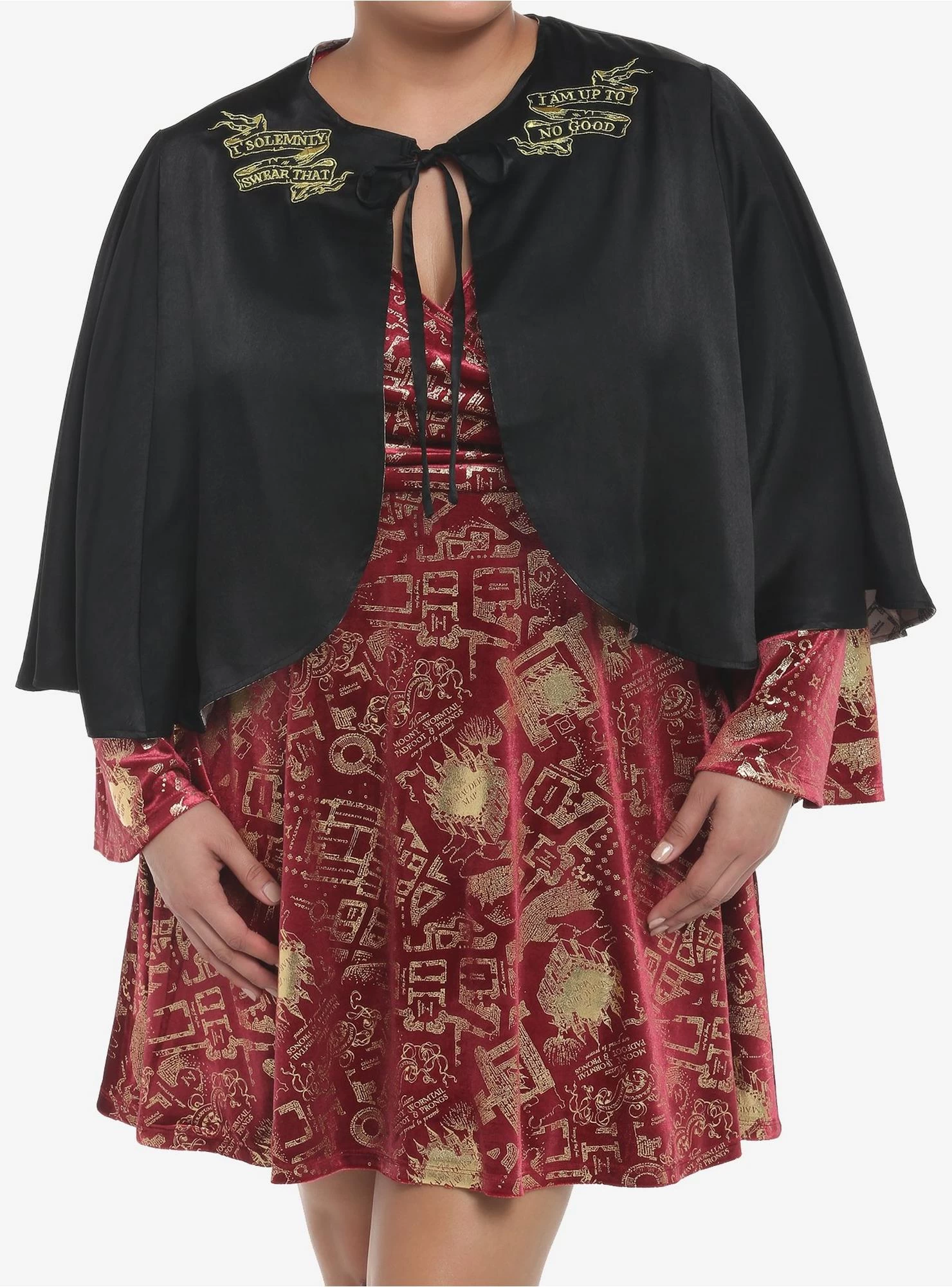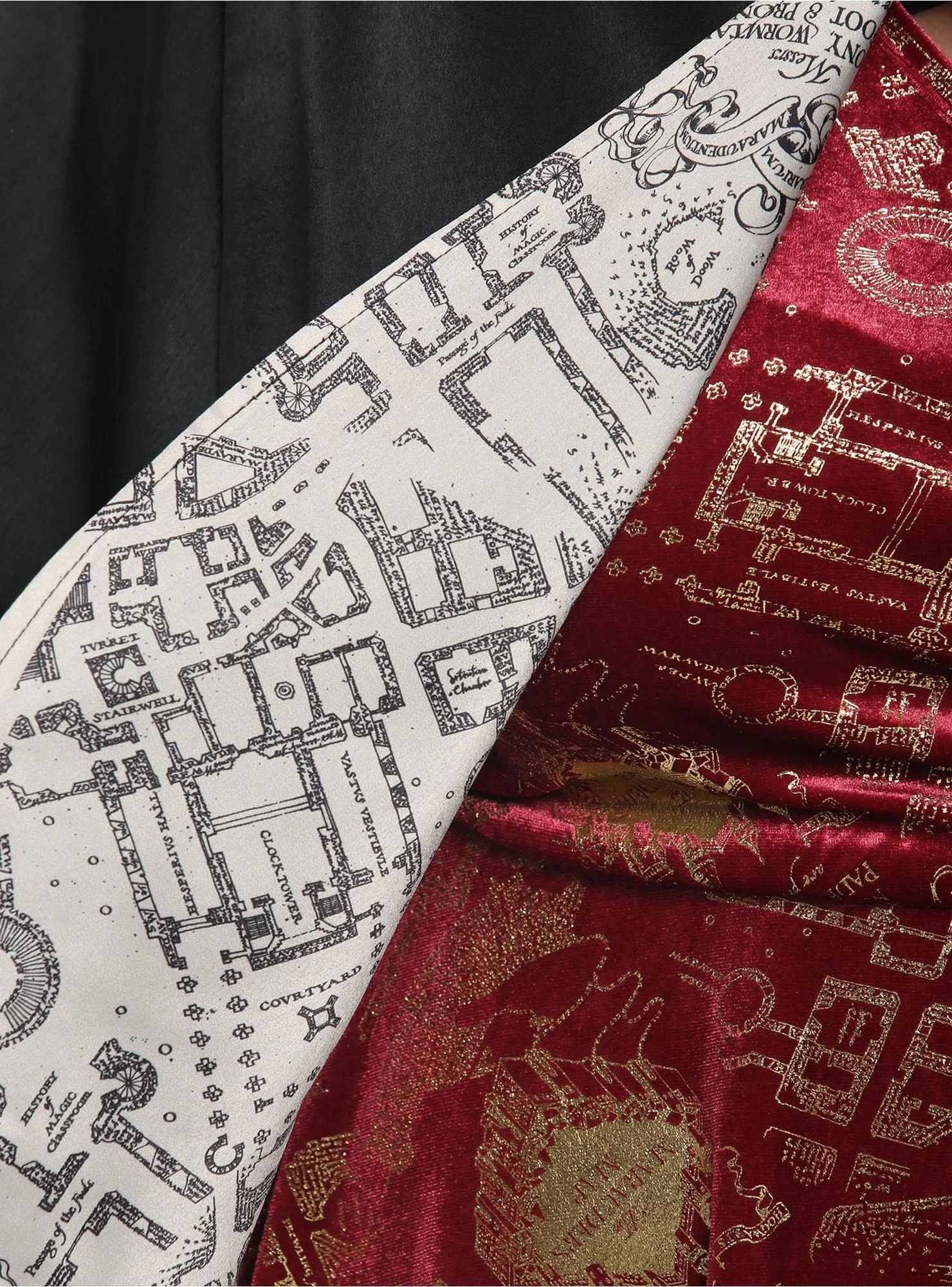 Trade in your boring wizard’s robes for something more mischievous! Get ready to strut about the castle in this Harry Potter capelet, inspired by your favorite magical artifact! This capelet is black on the outside and features gold banner embroideries at the chest reading, “I solemnly swear that I am up to no good.” Reveal its secrets with the lining highlighting an allover print of the Marauder’s Map. Complete with tie-front detailing.