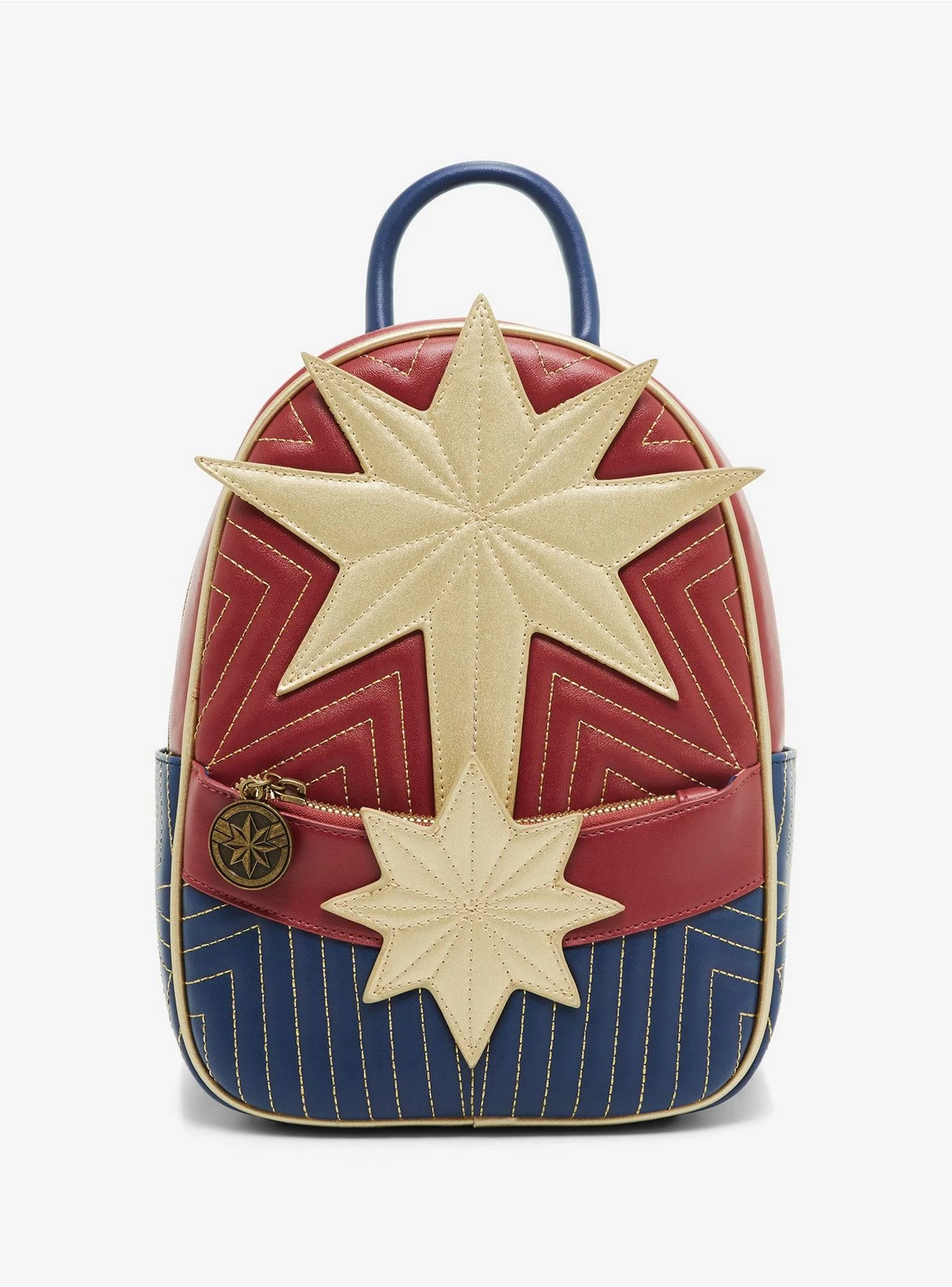 Pack all of your essentials for your trip to space with this The Marvels mini backpack! Inspired by Captain Marvel, this backpack features stitch and appliqué detailing that mimics her costume. Comes with adjustable straps, interior zipper pocket and front zipper pocket with a zipper pull of her logo.