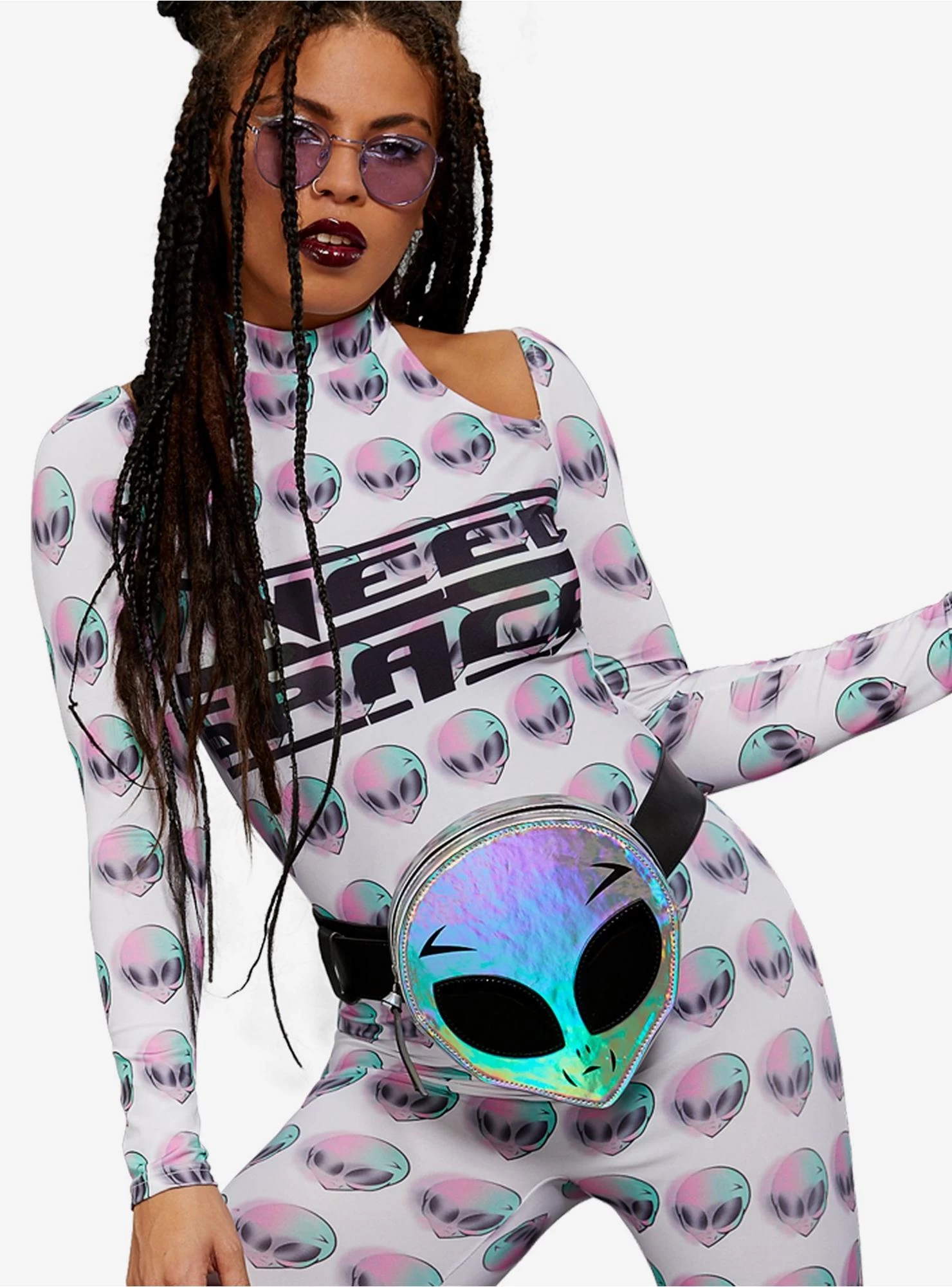 This alien fanny pack is out of this world! Zip closure and adjustable strap.