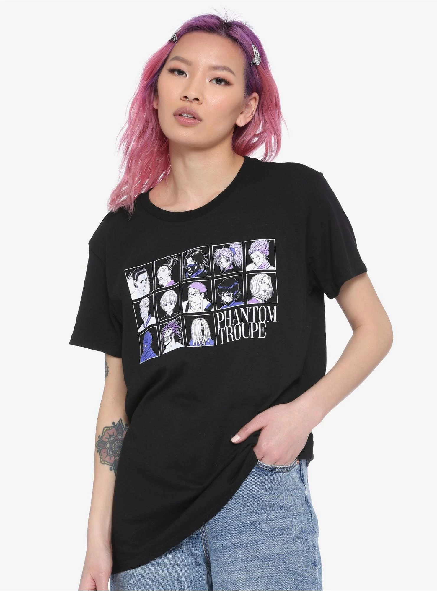 Don’t hide your affiliation to the Phantom Troupe! Wear it proudly to show your fellow spiders that you’re not afraid of the bounty. This Hunter x Hunter tee is printed with 13 members of the Troupe and it’s name on the front with a spider and Japanese text on the back.