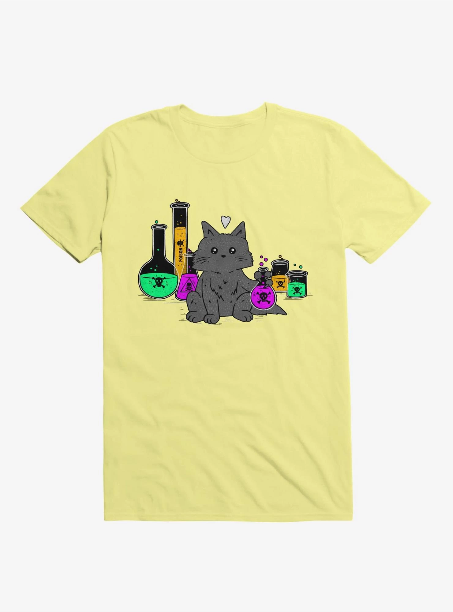 Beware of cats bearing poison. This lightweight corn silk yellow graphic tee visualizes what’s often on a cat-owner’s mind: “I think my cat wants to kill me!”