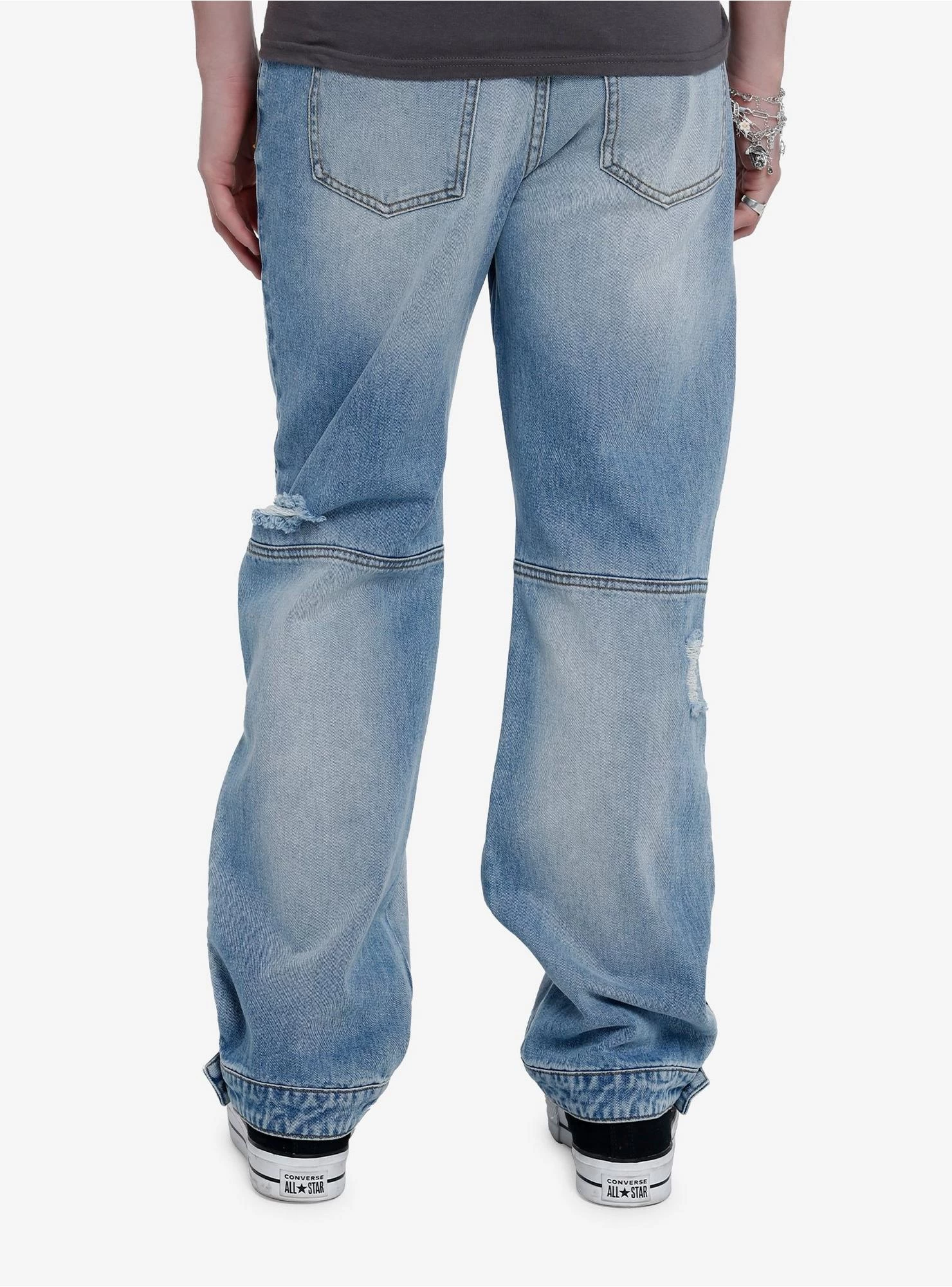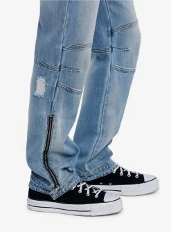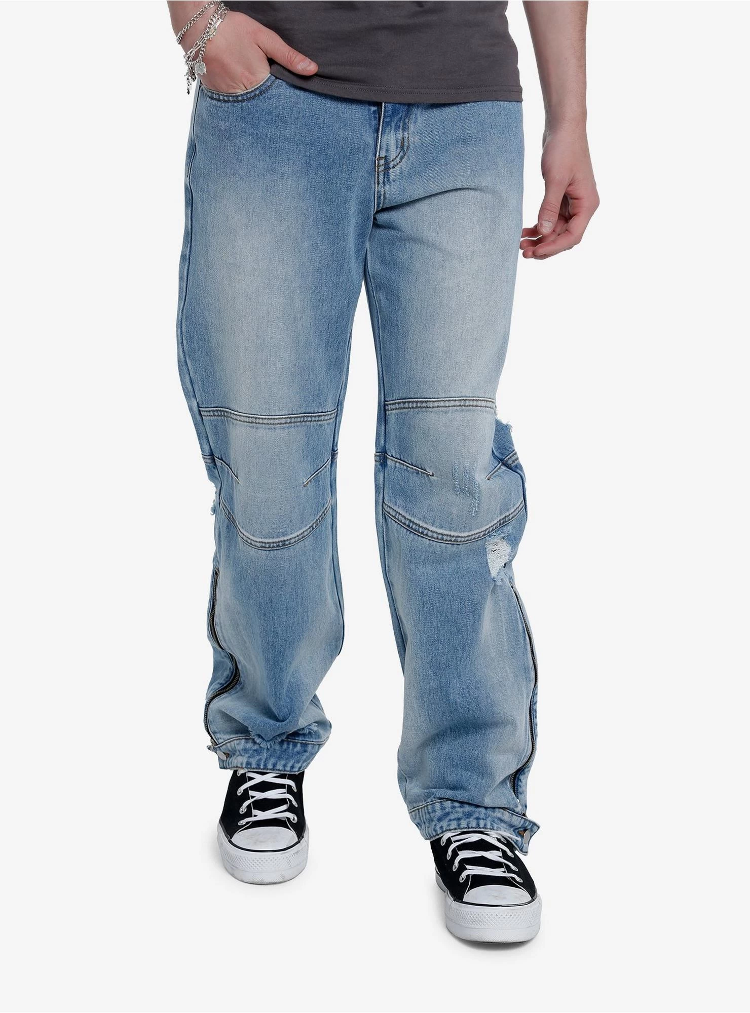 Every wardrobe needs a pair of blue jeans! This pair has a light wash and carpenter-style silhouette. Comes with classic 5-pocket styling, plus destruction and zipper detailing on the legs.