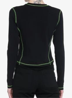 Hey human! Upgrade your wardrobe with something from out of this world. This baby long-sleeve tee from Invader Zim has a print of GIR and his pig flying across the center with the show logo printed underneath. Comes with neon green contrast stitching throughout.