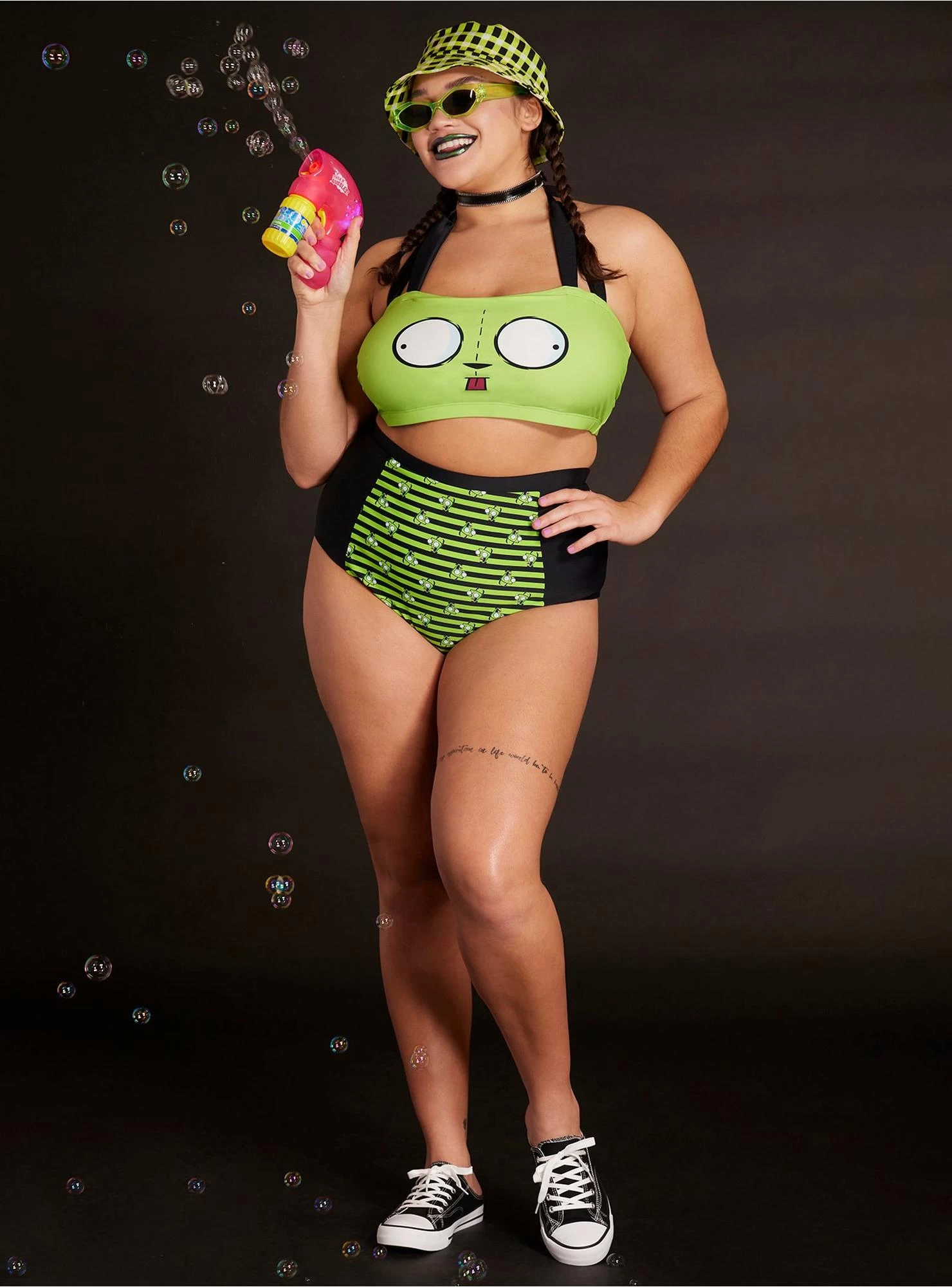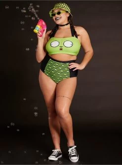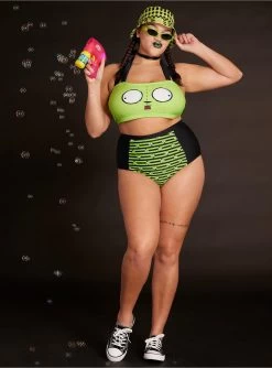 Planning to take over planet Earth? Let’s start at the pool! You’ll need to blend in with the humans, and GIR has you covered. These Invader Zim swim bottoms feature side panels of stripes and GIR. Pair with the matching top to complete your look!