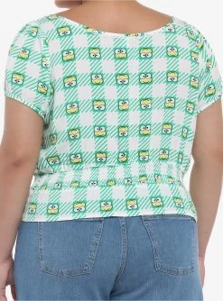 Looking for a top perfect for outdoor hangs with friends? Your fave resident of Donut Pond can help! This peplum top boasts a wholesome gingham print decorated with Keroppi’s face, a tie neckline, slight puff sleeves and lace detail.