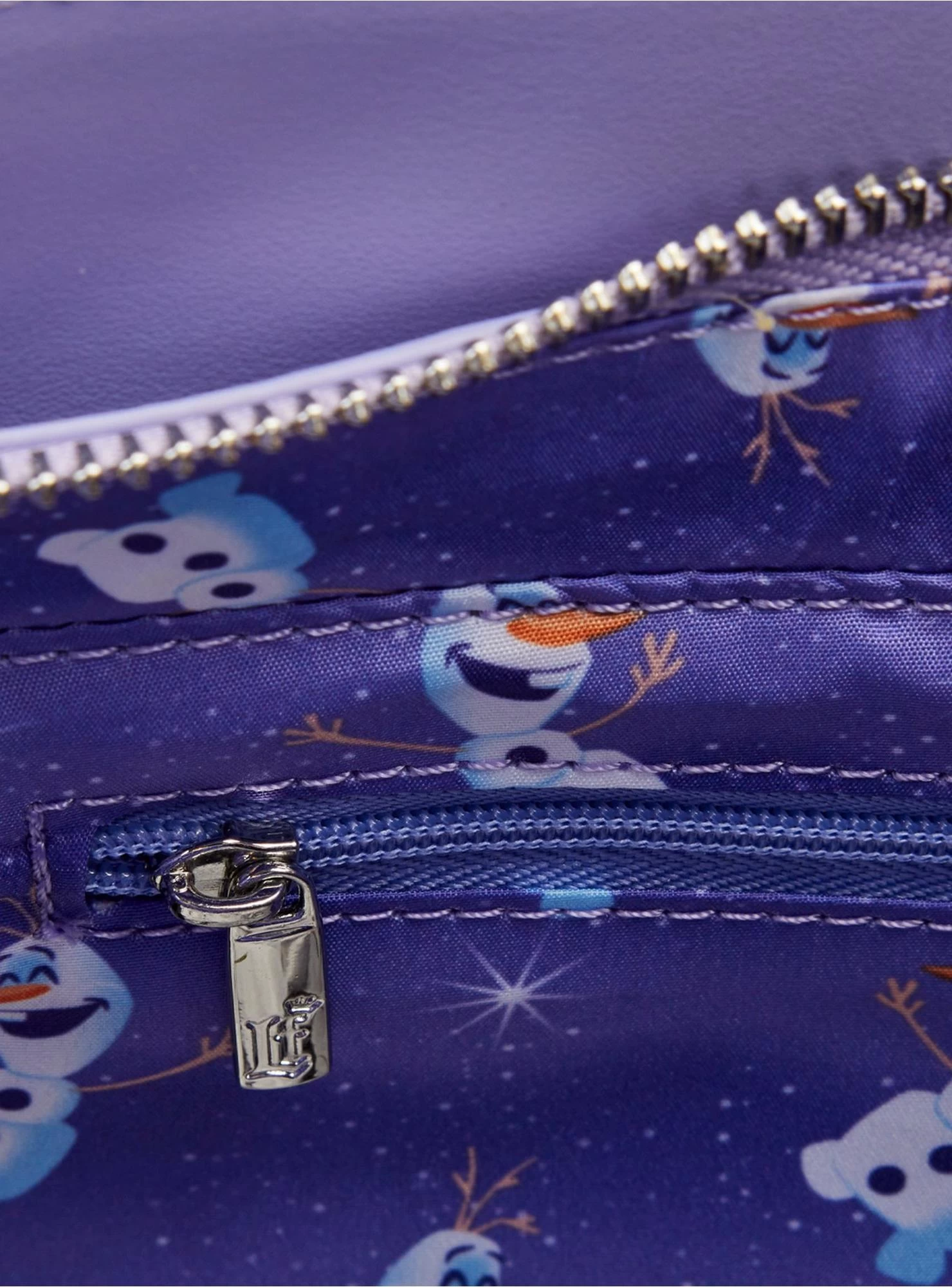 Glide along a shimmering frozen wonderland with Olaf on this Frozen crossbody bag! On the front of the bag, Olaf slides on the ice in front of Elsa’s ice palace, which reaches up and over the top of the purse and glimmers with iridescent silver foil details. On the back, Elsa, Anna, Kristoff, and Sven make an appearance. Comes with a detachable crossbody strap, interior zipper pocket and top carrying handles.