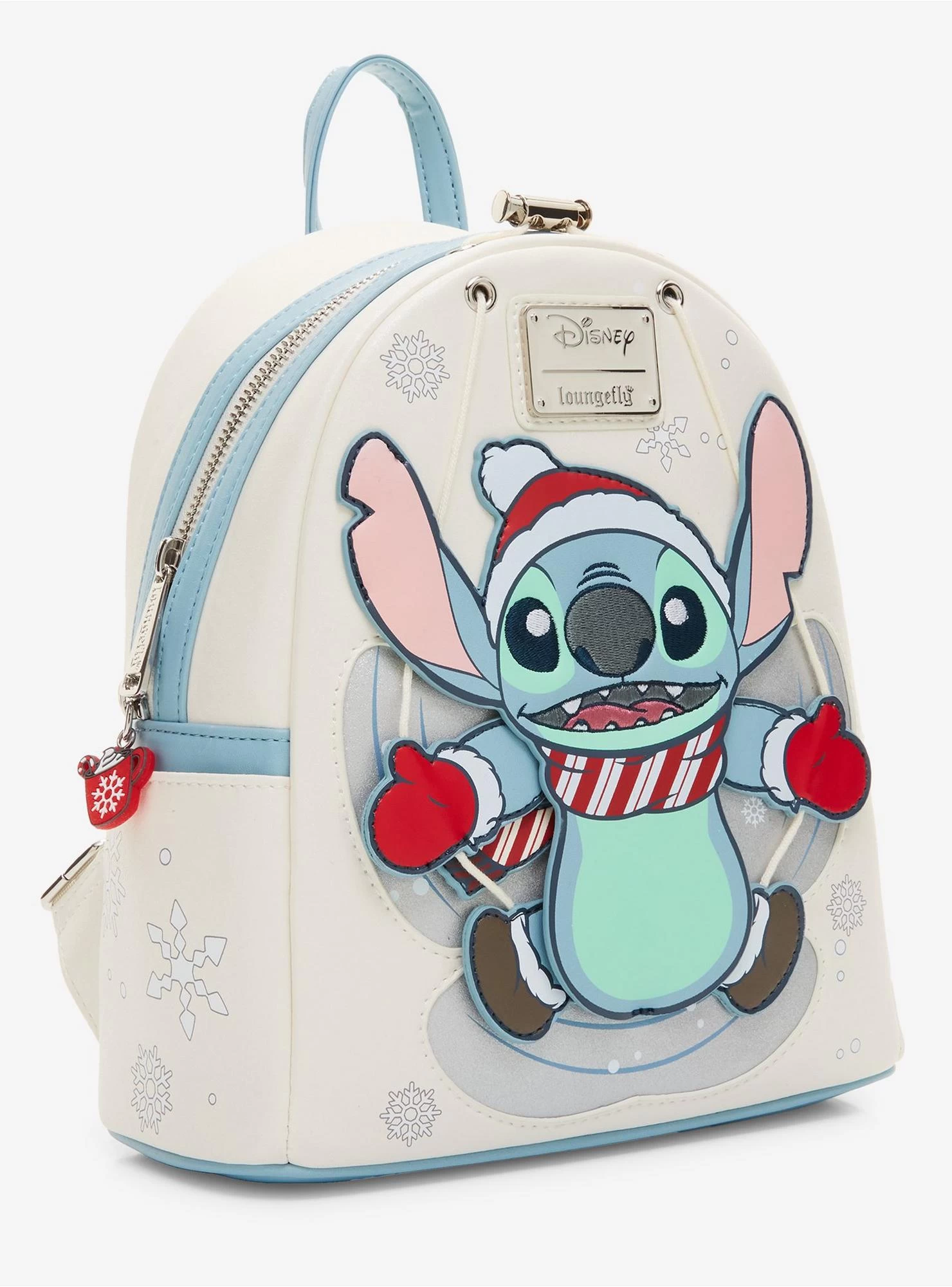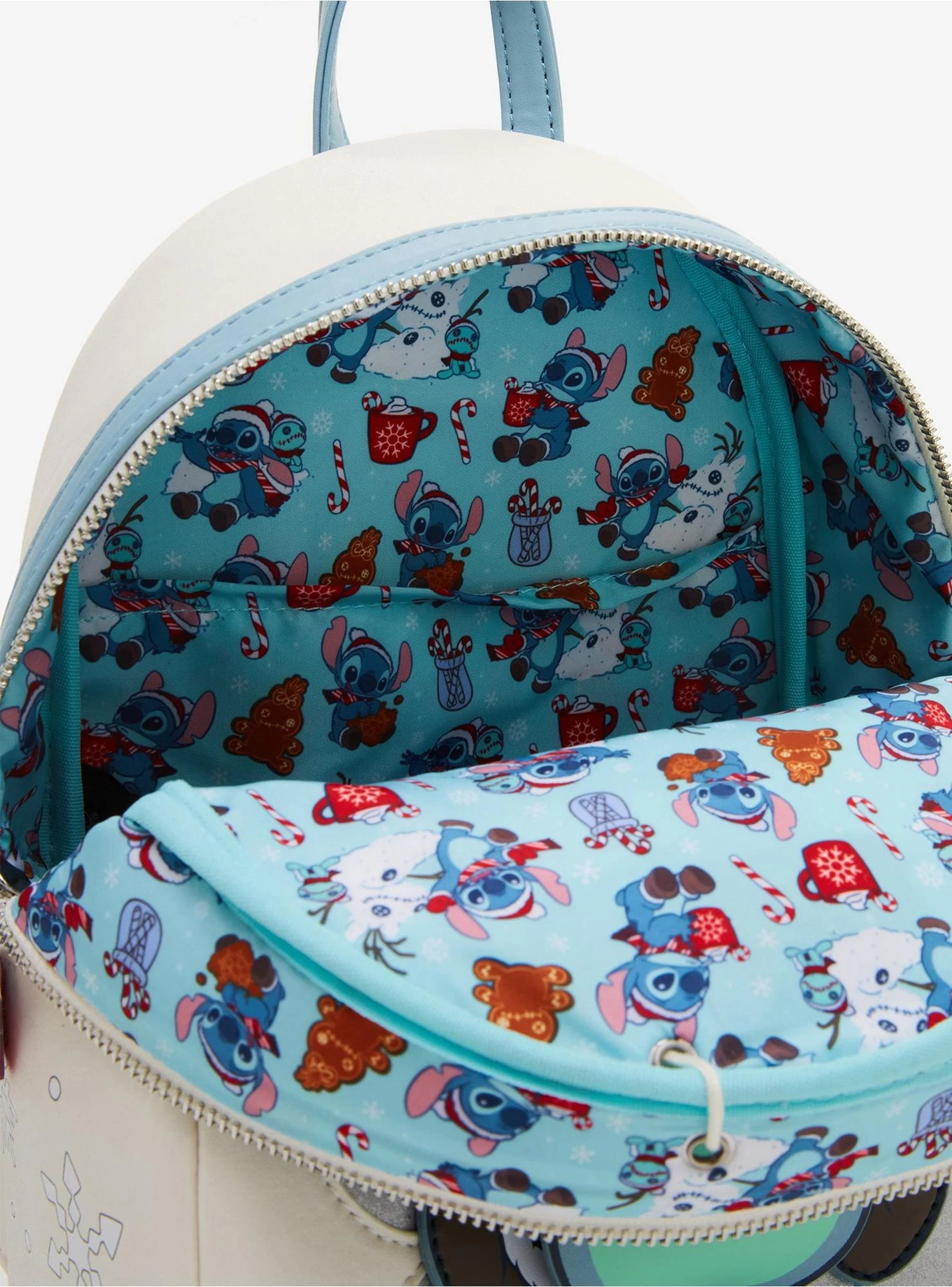 Stitch is leaving behind the tropical holidays for a snowy winter wonderland! This glittery Lilo & Stitch mini backpack features an appliqué of Stitch making a snow angel on the front, with arms and legs that swivel with the attached cord. Comes with side pockets, a hot cocoa silicone zipper charm and an interior drop pocket.