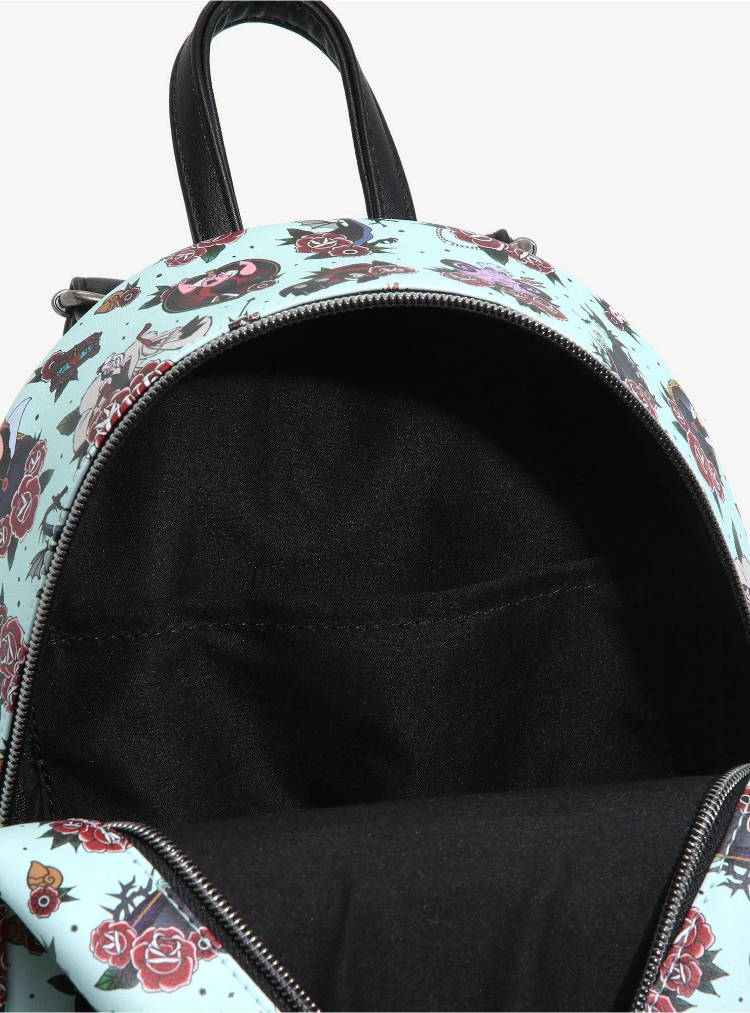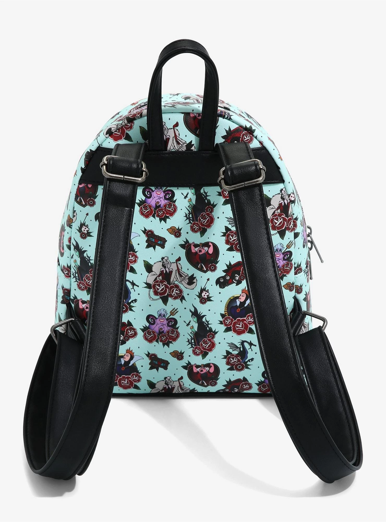 Make sure your outfit is bad to the bone with this deliciously evil mini backpack! Features your favorite Disney villains like the Evil Queen, Ursula, Maleficent and more in a tattoo art design. Comes with front zipper pocket, gunmetal-tone hardware and interior drop pocket.