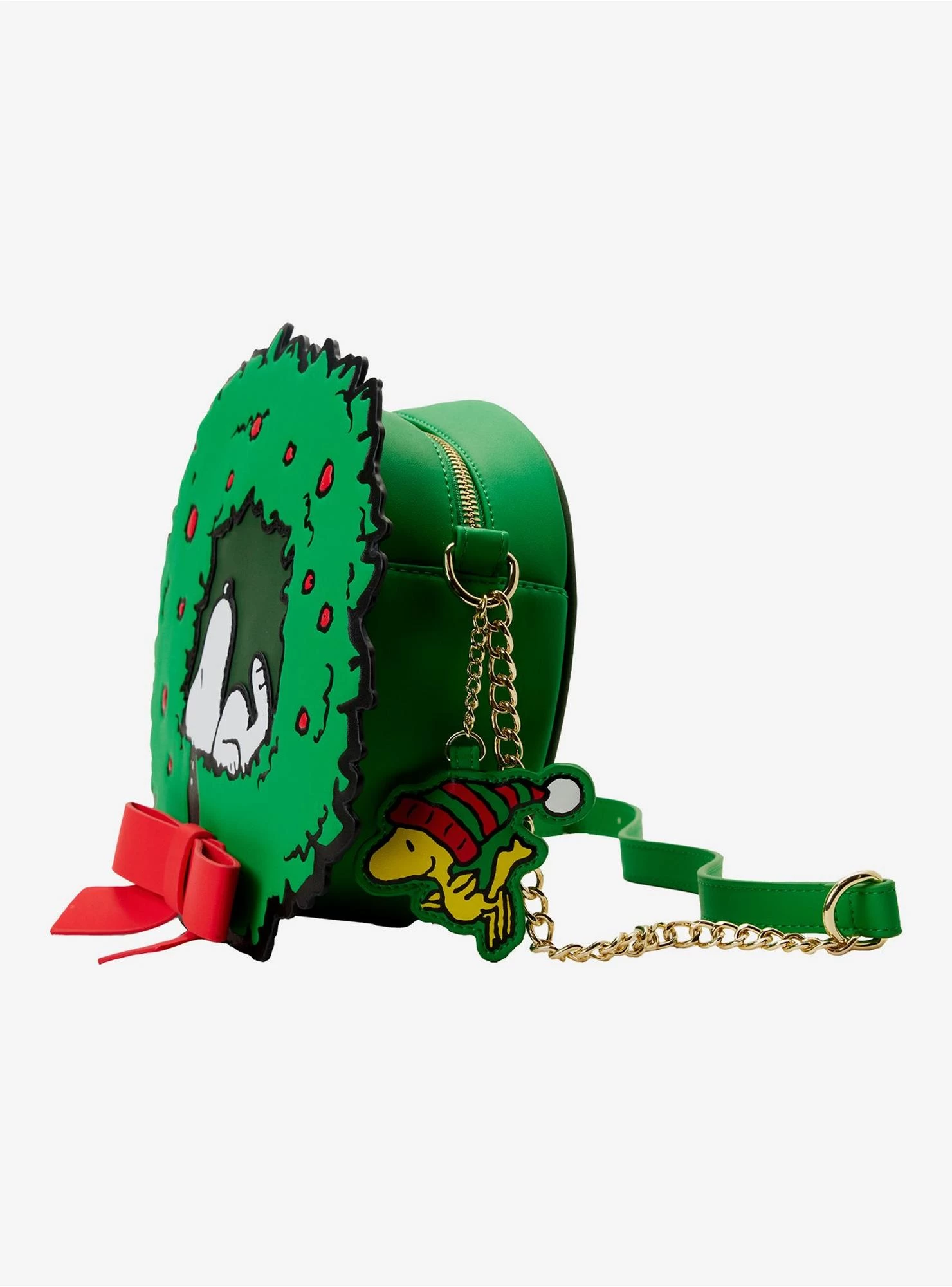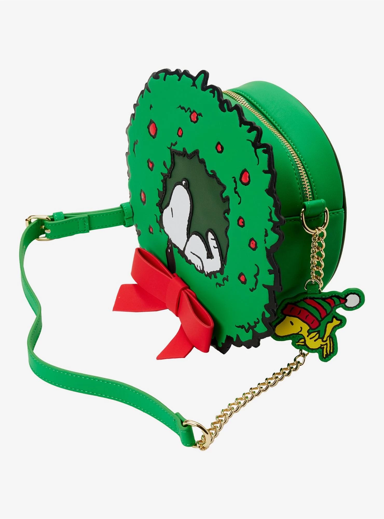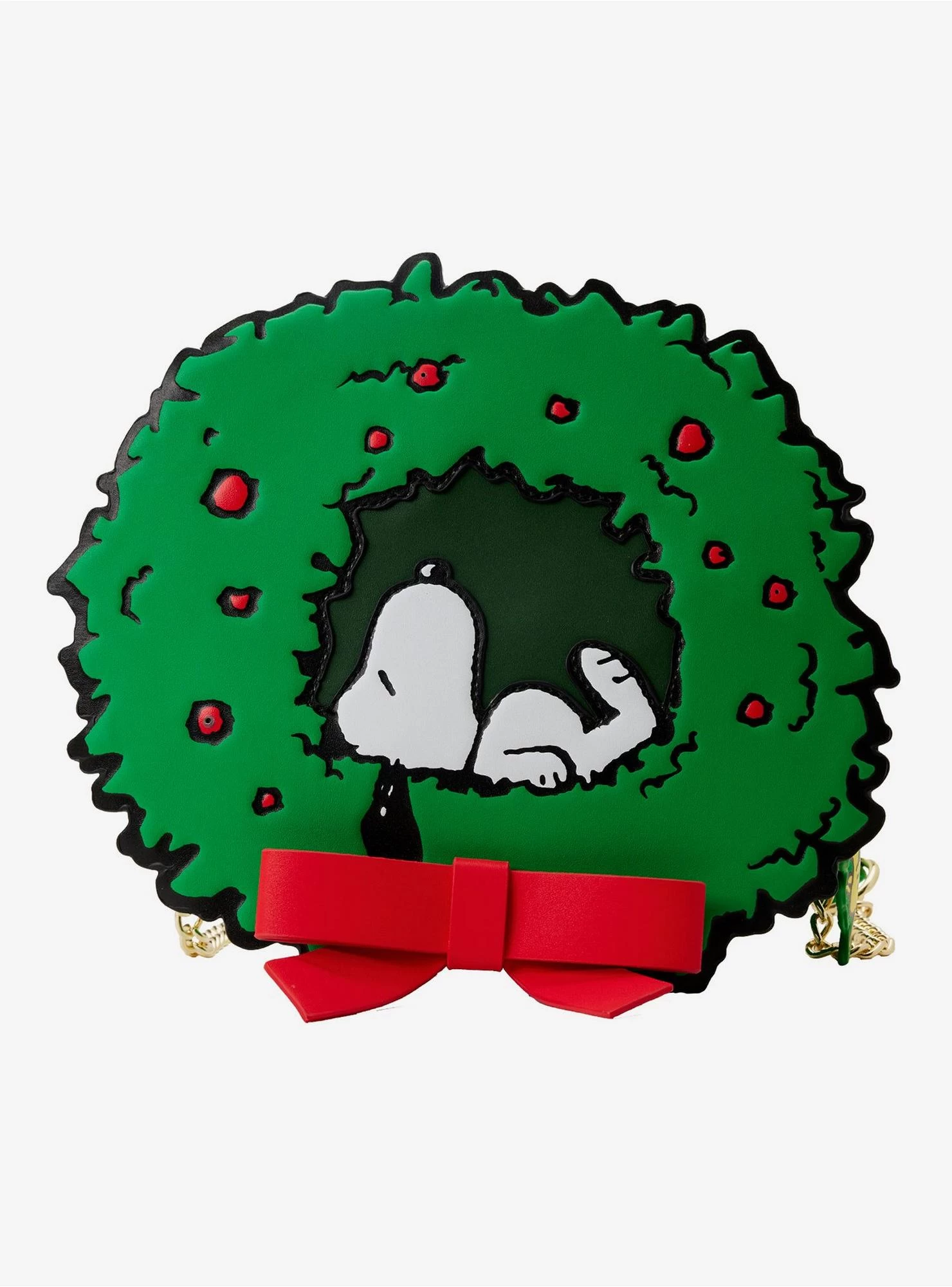 Snoopy and Woodstock are welcoming the holiday season in style with this festive crossbody bag! Putting his award-winning décor skills to work, Snoopy has decorated a winter wreath with a cheerful red bow. As he takes a nap in the wreath’s center, red berries light up the boughs around him for a flashy addition to the festivities. Woodstock joins the fun as a bag charm, where he wears a cozy winter cap. Comes with an adjustable and detachable chain strap and zipper closure.