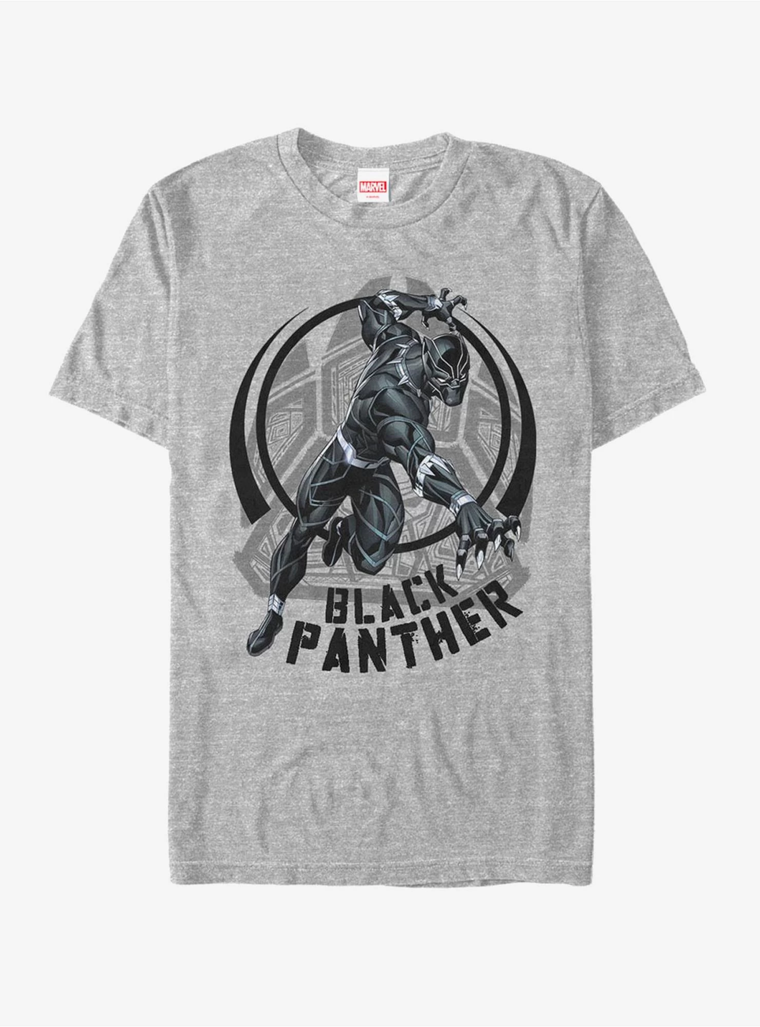 Help T’Challa find his father’s killer with the power of the Marvel Black Panther Circle Claw Heather Gray T-Shirt. The Black Panther is portrayed with his vibranium claws and “Black Panther” below on this cool gray Marvel shirt. 50% Cotton, 50% Polyester.