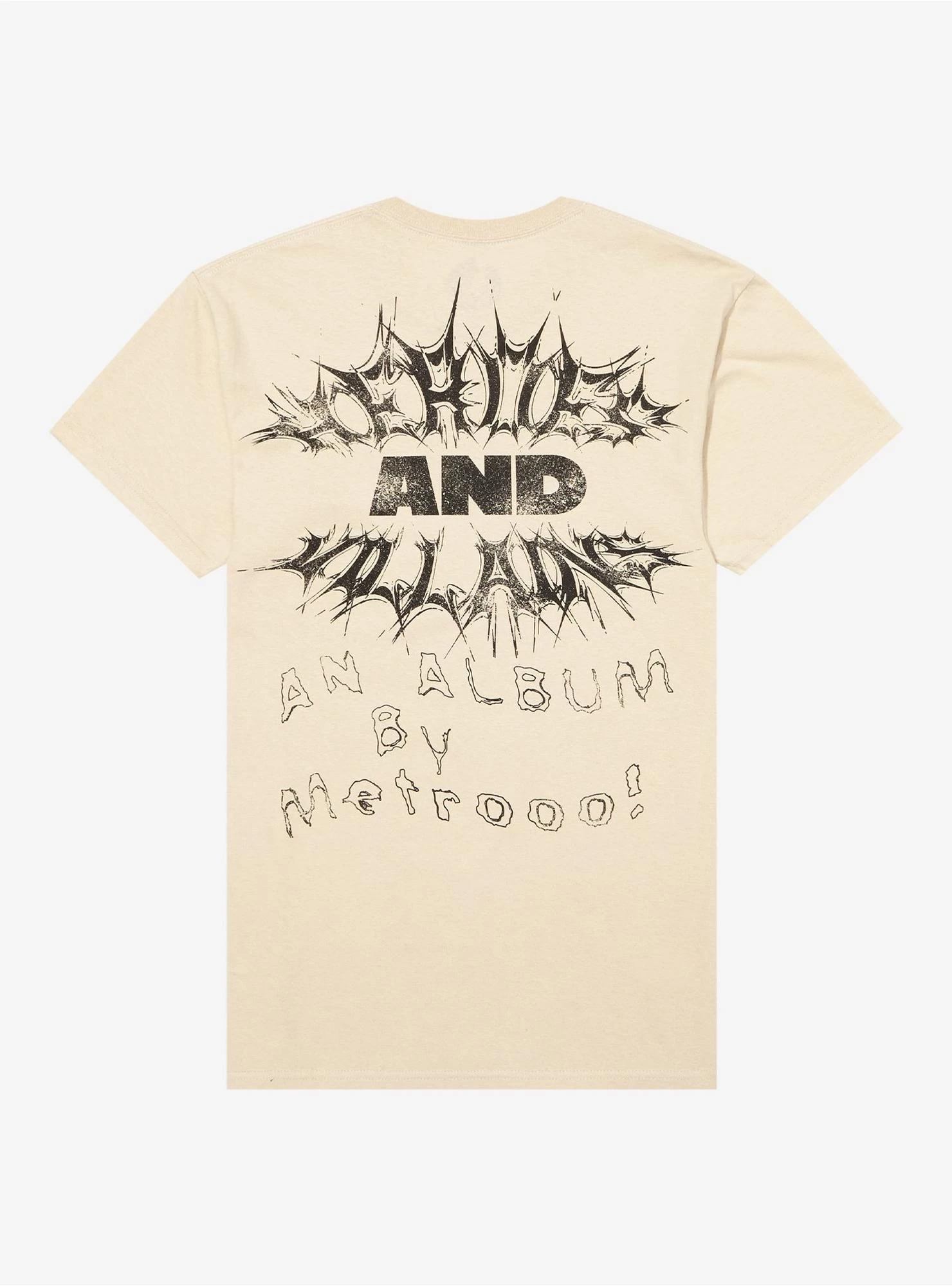 This Metro Boomin tee reps the artist’s Heroes & Villains (2022) album with a watercolor-style graphic of a figure looking off a balcony onto a dark landscape. The back says “Heroes And Villains An Album By Metrooo!” in stylized font.
