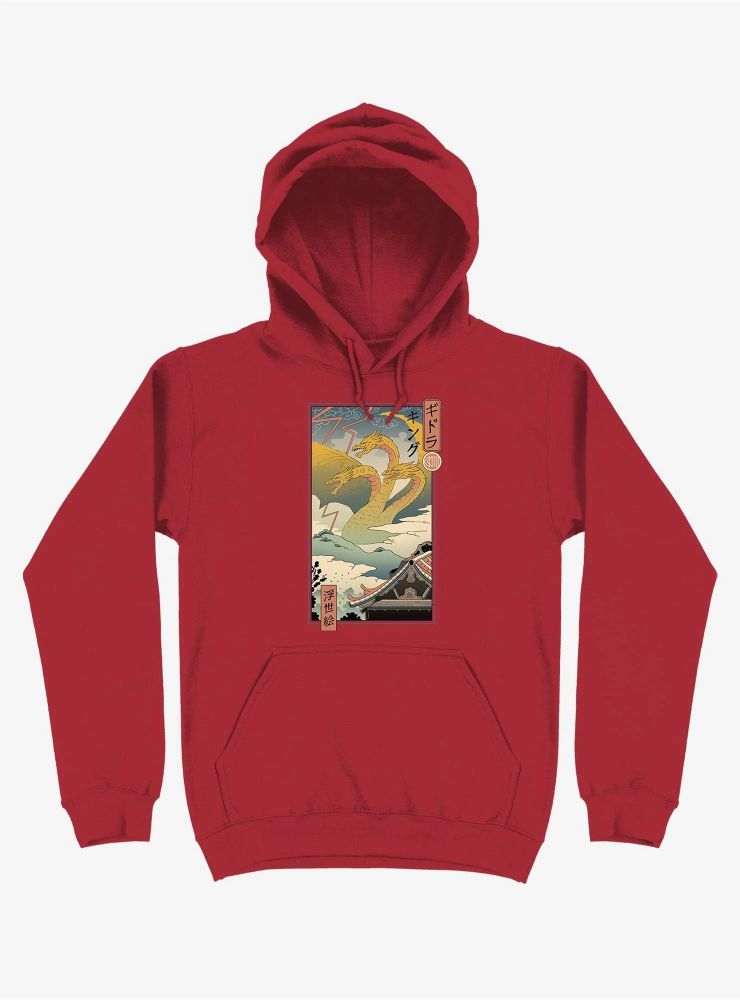 One monster, three heads. This red pullover hoodie features perhaps the most fearsome kaiju of all in a Japanese woodblock-inspired design.