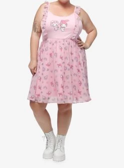 Look as sweet as your favorite duo with this adorable pink dress! Featuring My Melody and My Sweet Piano holding roses at the bust. Comes with ruffle straps and a mesh skirt overlay with an allover print of the two and roses.