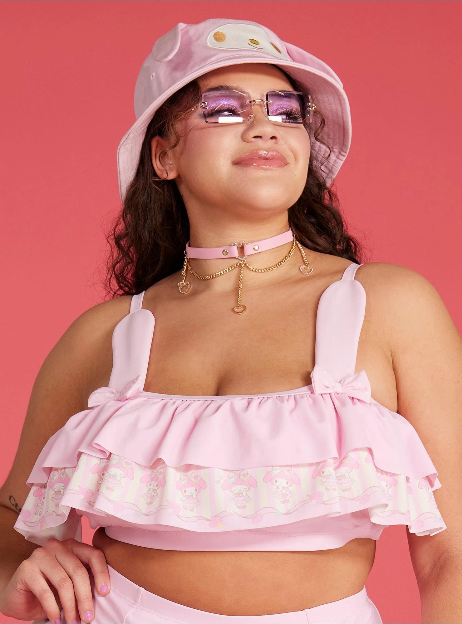 Keep your poolside look sweet with My Melody! Your favorite Sanrio character is ready to have some fun in the sun with you. This ruffle swim top features a layer with My Melody dressed up in a lolita-inspired outfit printed along the hem, and adjustable rabbit ear-shaped straps adorned with bows. Comes with removable padding. Pair with the matching bottoms to complete your look!
