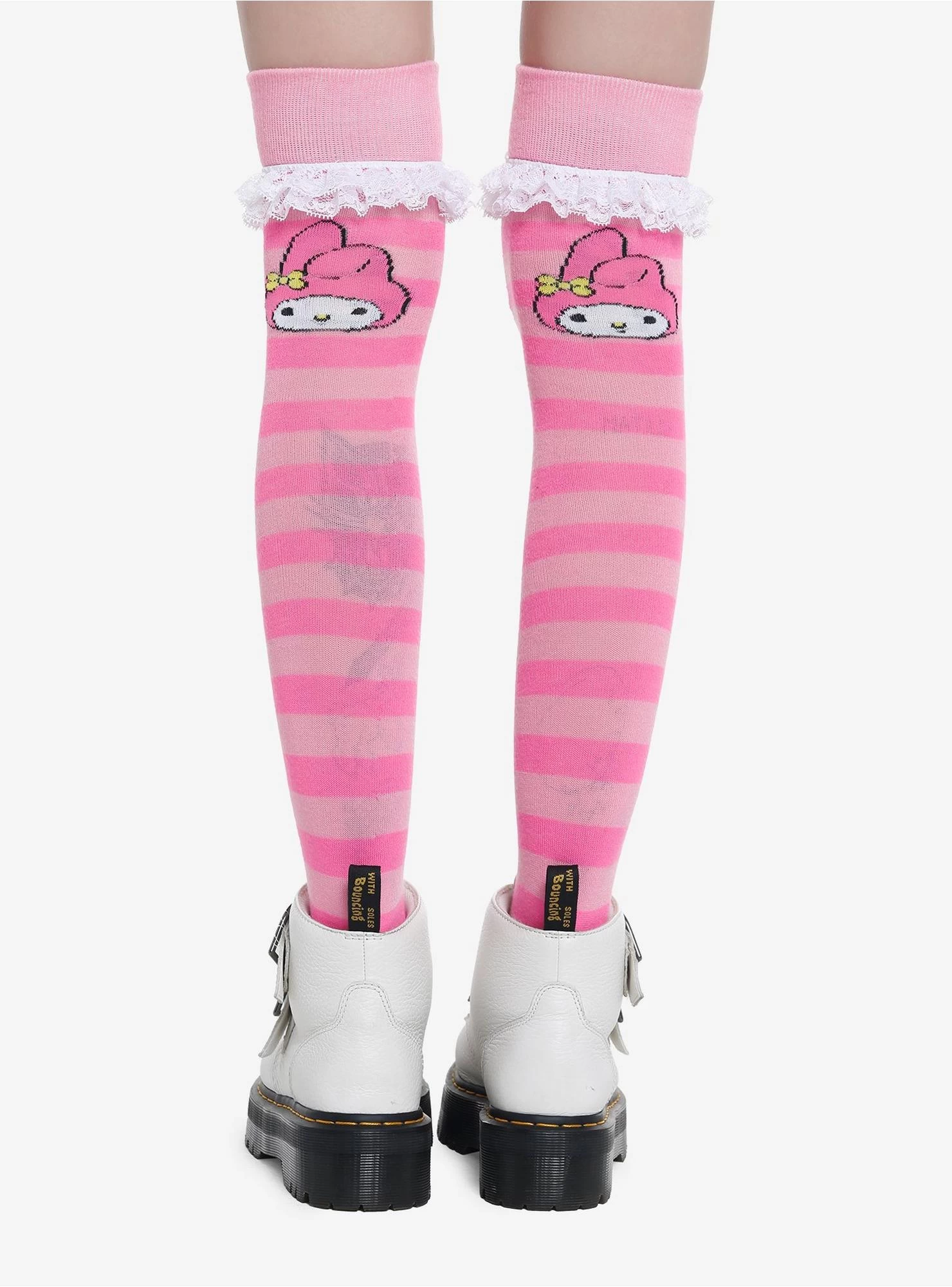 Keep your outfit as sweet as My Melody! These over-the-knee socks feature bold pink stripes all around, with My Melody on the front facing side on the knee. Comes with lace frills up top and a dainty bow.