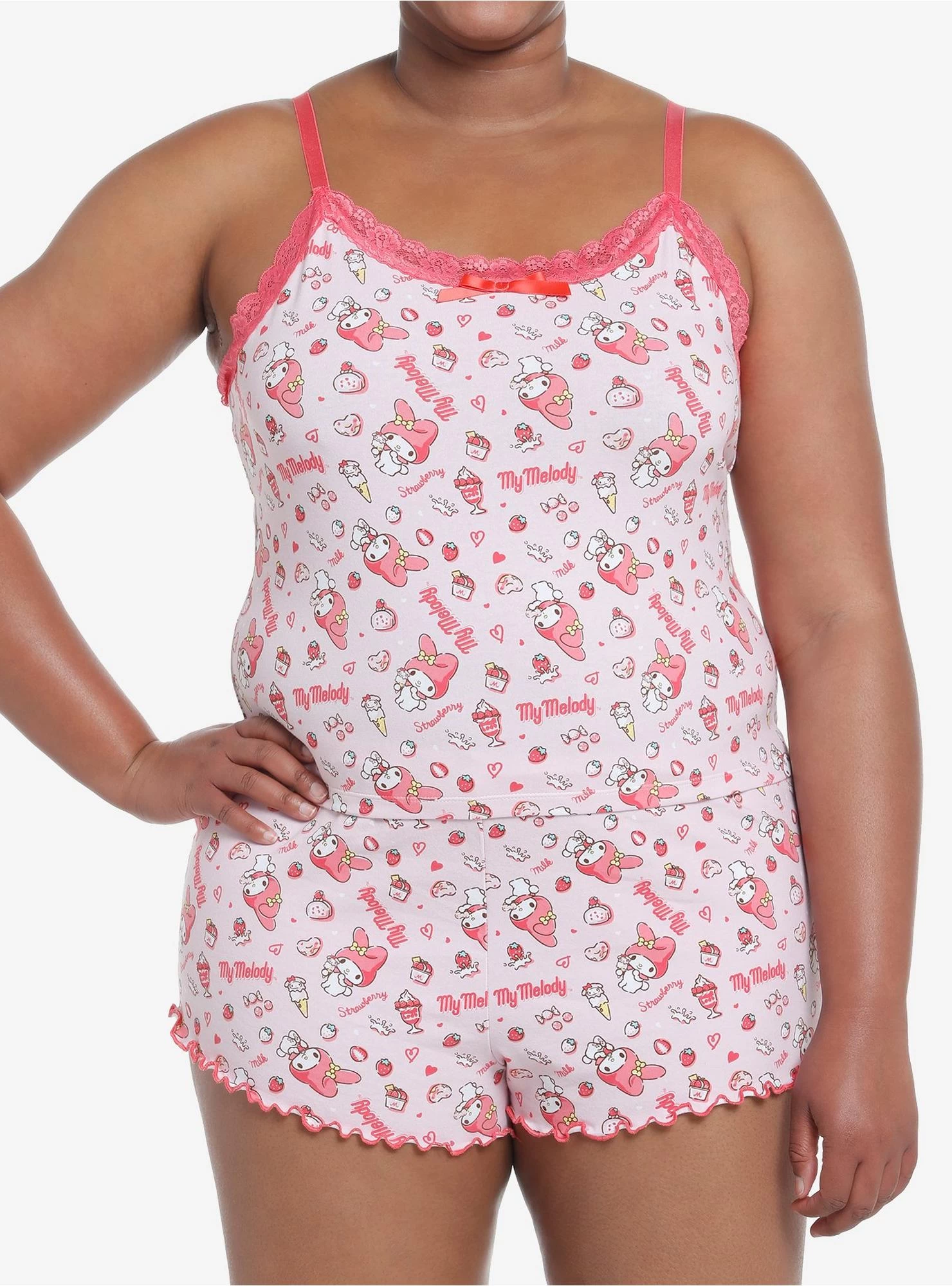 Get cozy and ready to have some sweet dreams! We’ve got the perfect ‘fit for your next sleepover with your Sanrio bestie! This lounge set features a cami and matching shorts with an allover print of My Melody and desserts. The cami features lace trimming at the top and dainty bow detailing, plus adjustable straps. The shorts come with lettuce trimming and an elasticated waistband for comfort.