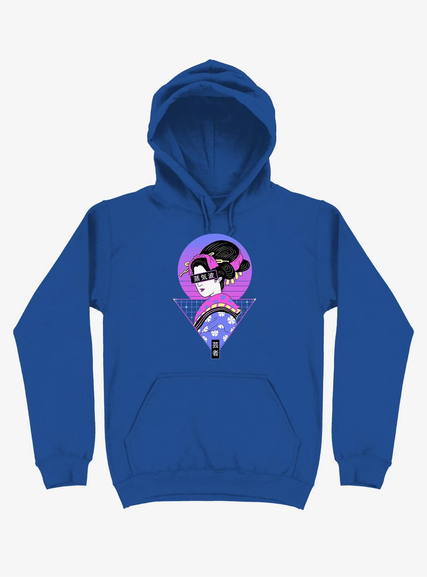 Geisha gets a vaporwave aesthetic makeover with geometric shapes and neon hues. Yep, you need this royal blue pullover hoodie in your life.