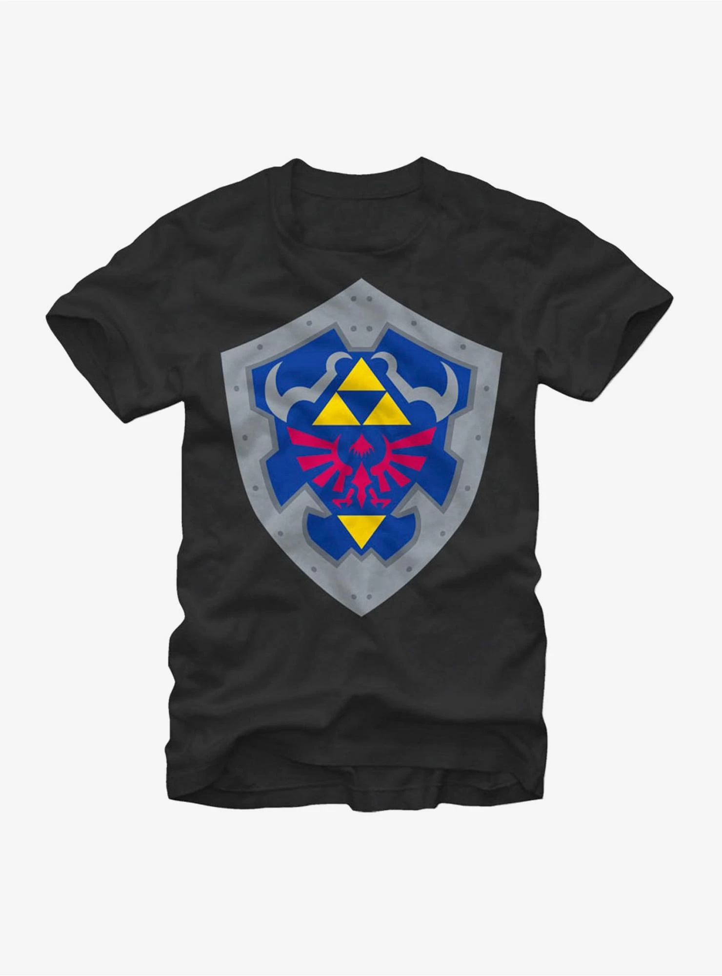 Join the ranks of Link and the Knights of Hyrule with the Nintendo Hylian Shield Black T-Shirt. This black graphic tee is emblazoned with a Hylian shield featuring the Triforce and the Crimson Loftwing for total authenticity. 100% Cotton.