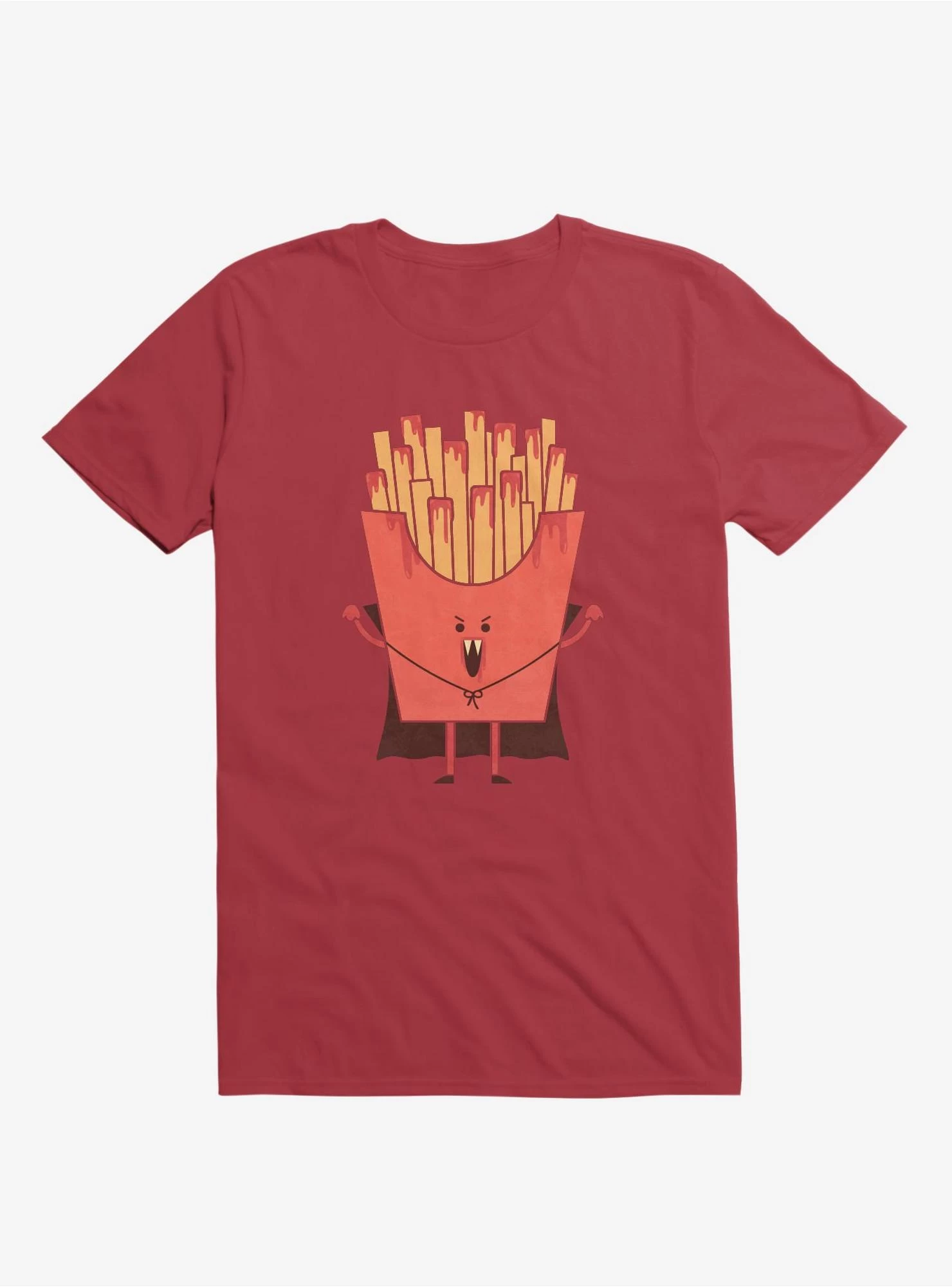 Garlic fries, begone! Nospotatu likes it old school, and that means ketchup. This lightweight red graphic tee features a carton of vampire fries.
