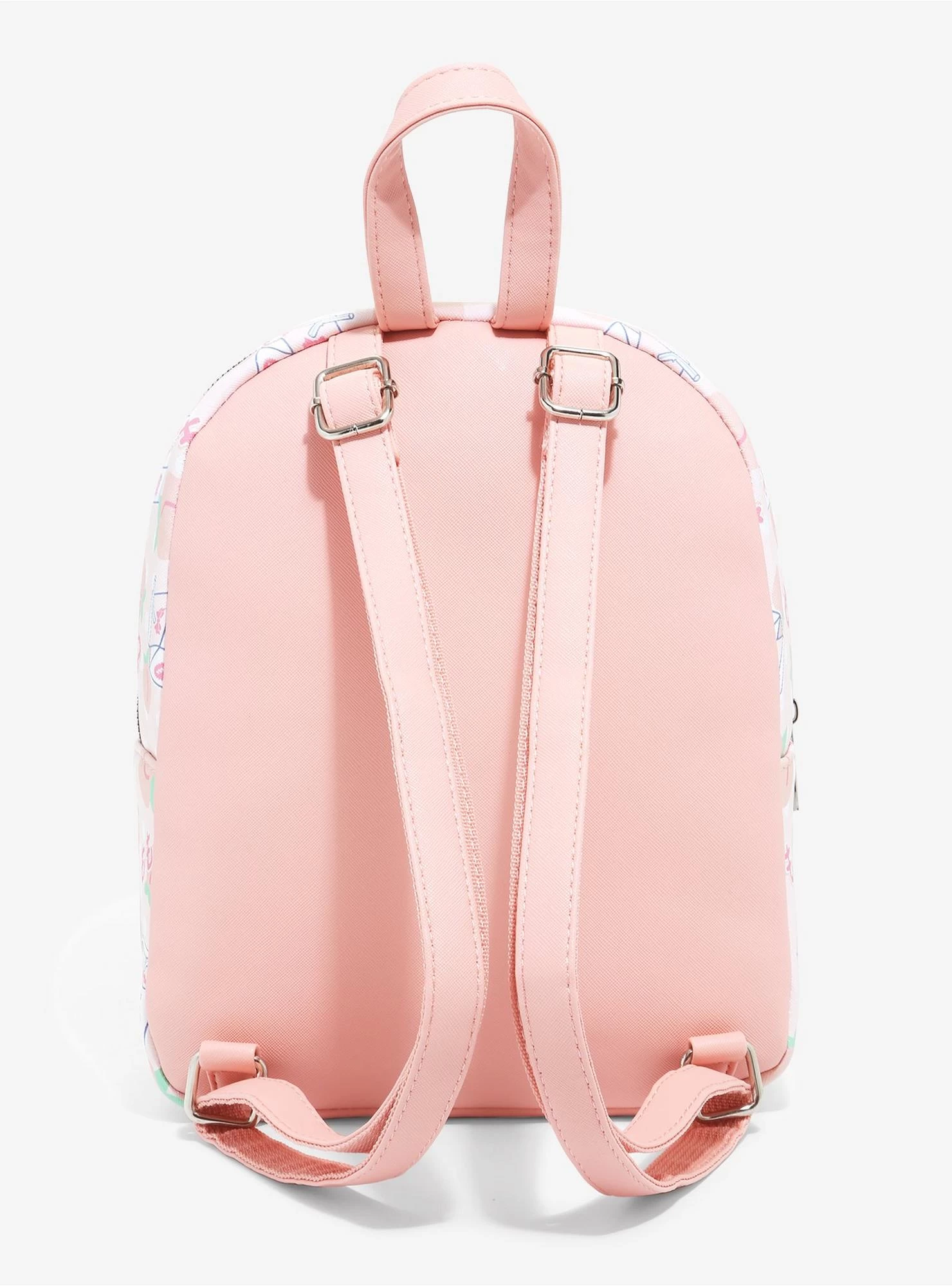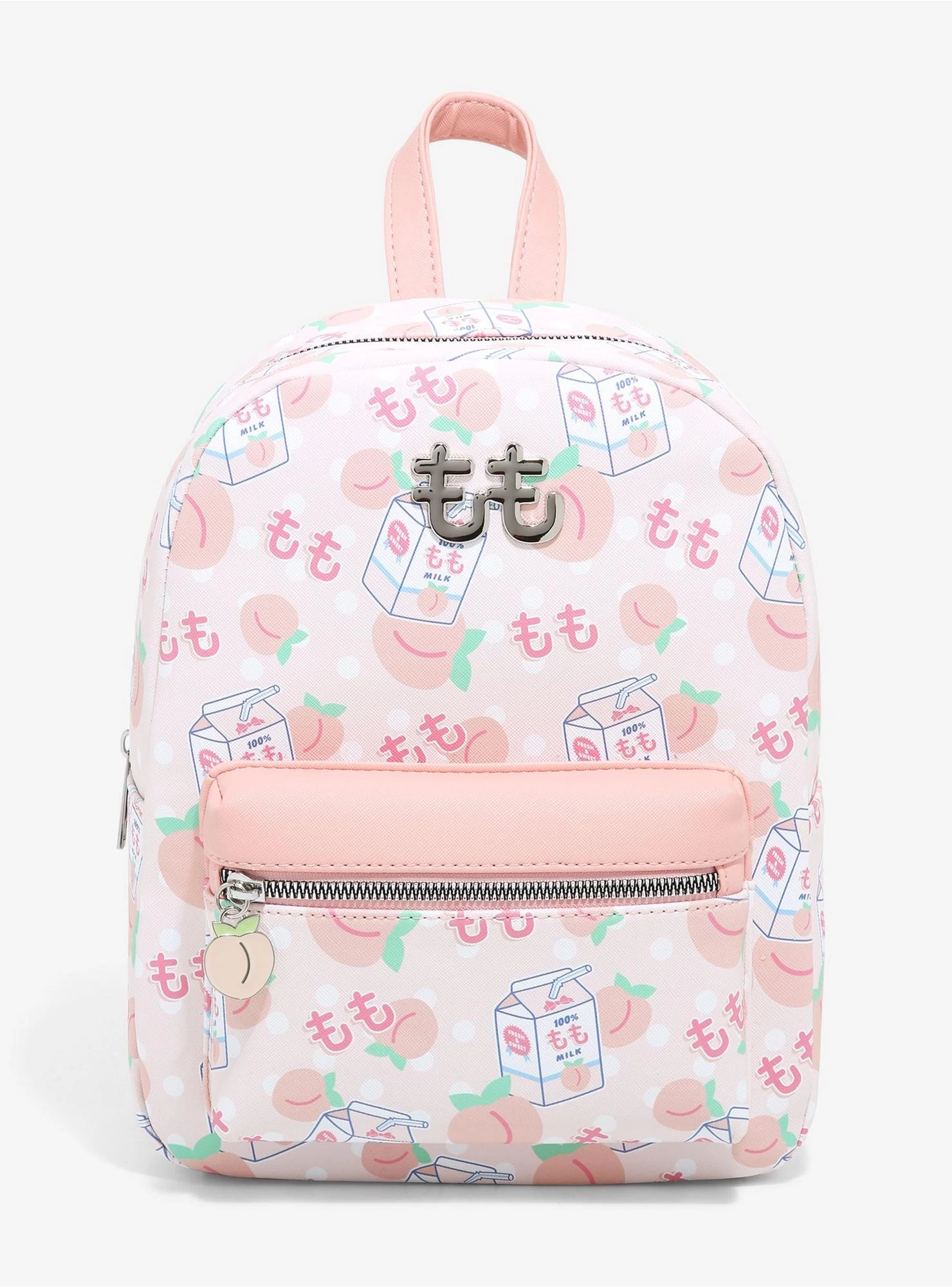 Stuff all the peaches you want into this mini backpack! Straight out of your pastel dreams, this backpack has an allover print of peaches, peach milk cartons and Japanese text, with an enamel peach zipper pull on the front pocket and an embossed logo. Adjustable straps and silver tone hardware.