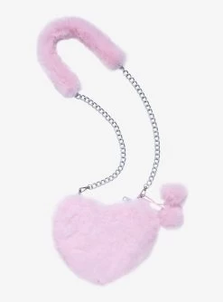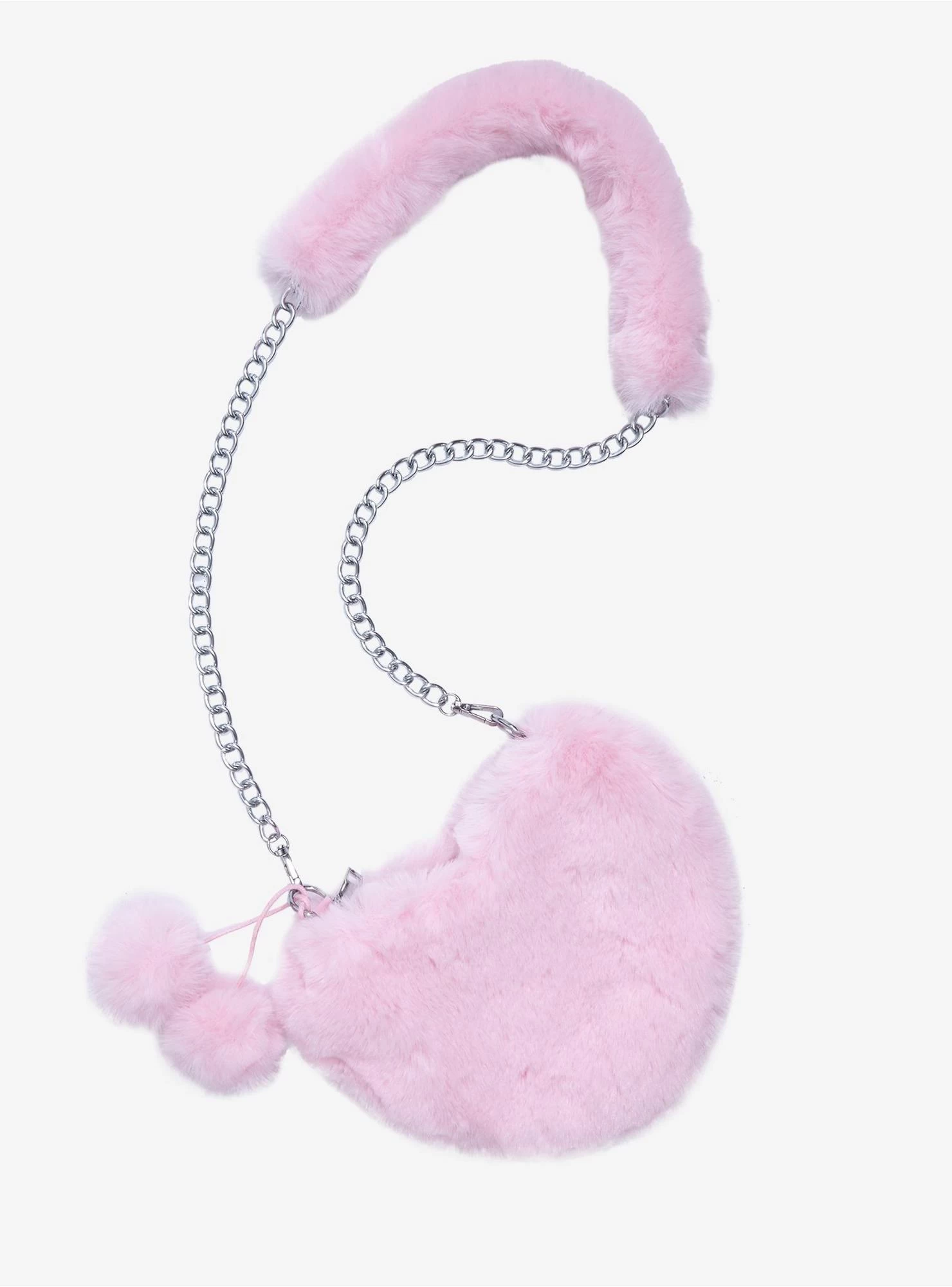 Rep those Y2K vibes with this supercute bag! This crossbody bag features a pink faux fur heart design and a detachable chain and faux fur strap. Comes with pom accents, an interior drop pocket and a top zipper closure.