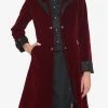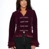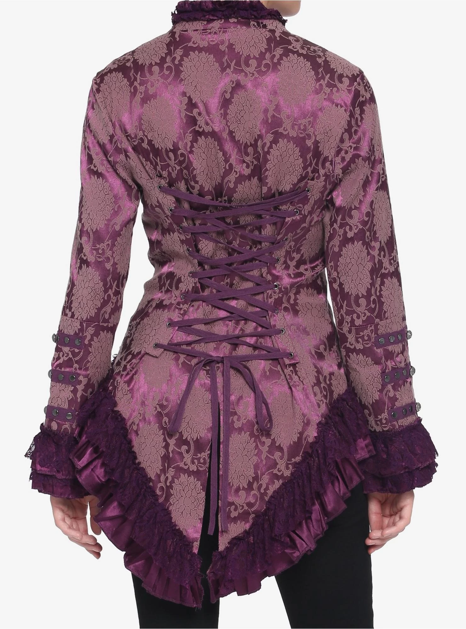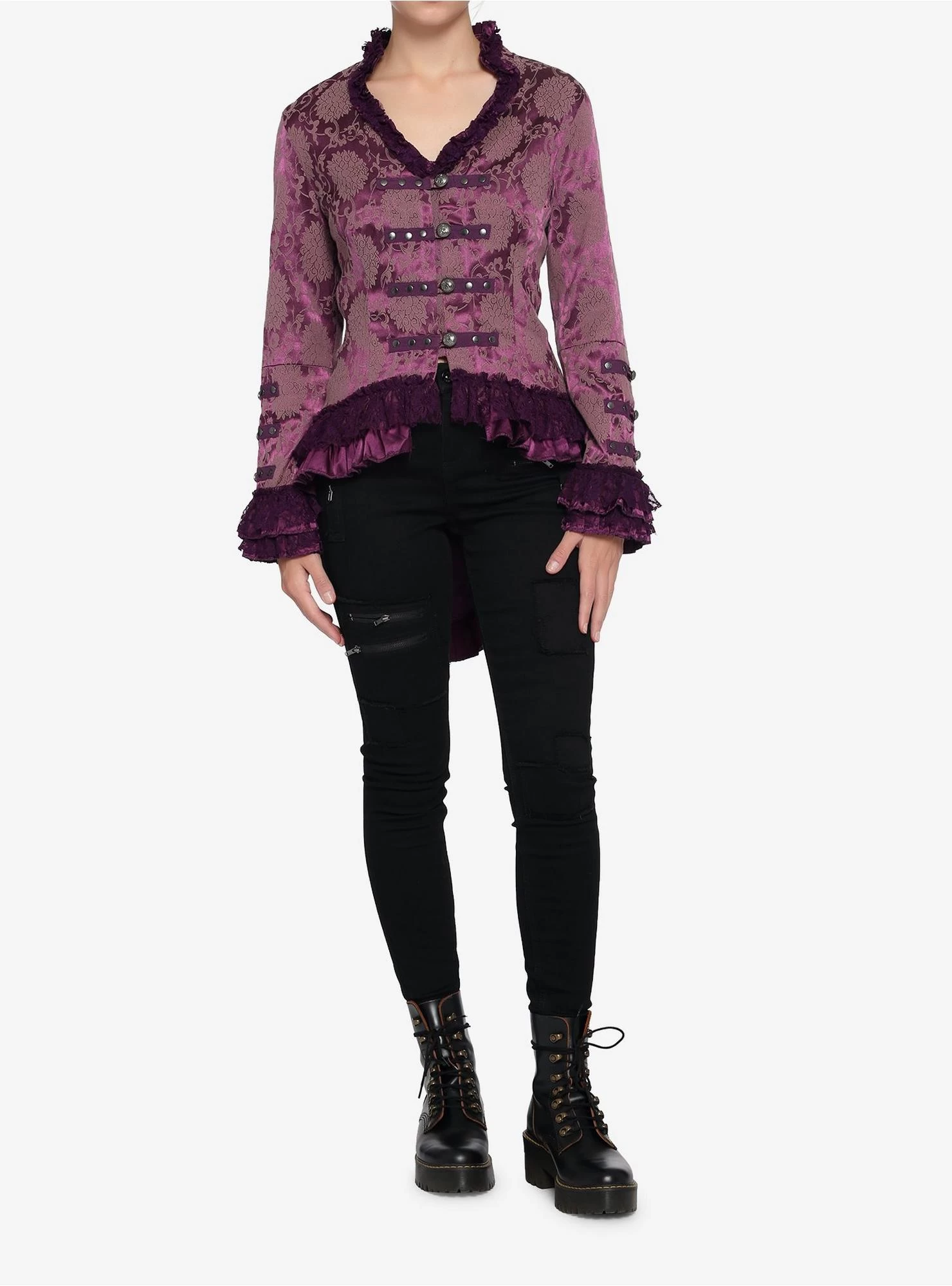 Make any look instantly more elegant with this purple brocade jacket. Featuring lace and satin ruffles around the cuffs, hi low hem and collar, with a dome button closure and functional back lacing. Create your own all black look with a maxi skirt or skinnies for maximum drama! Model wears size Small. Wash cold, line dry.