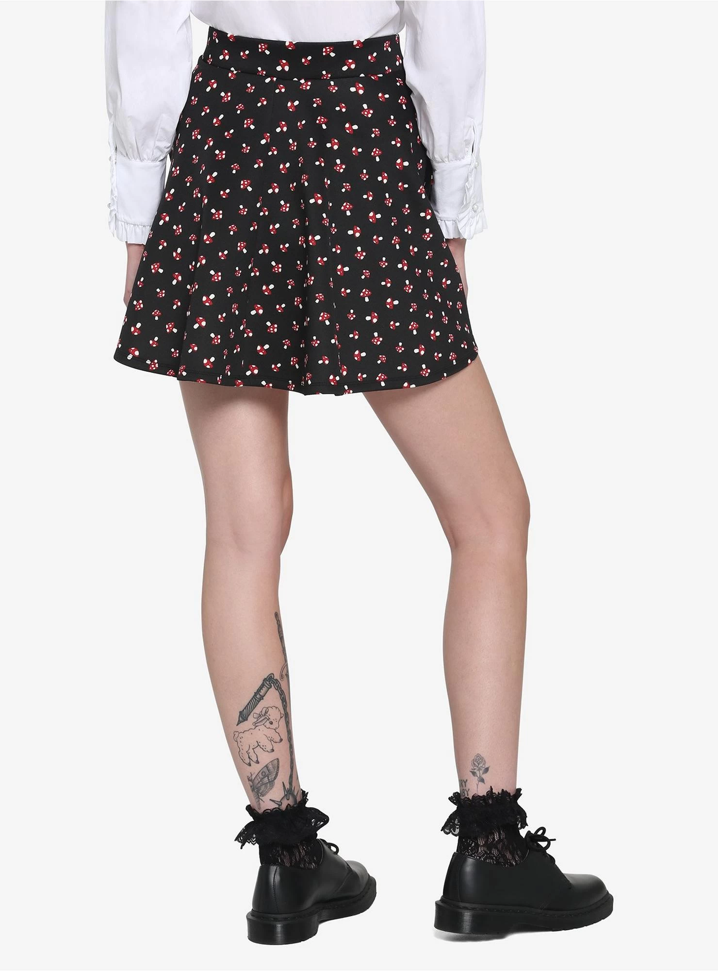 Keep your cottagecore look going with this black skater skirt featuring a red mushroom print, double lace-up detailing and pockets.