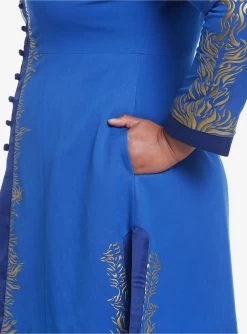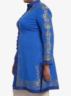 Summon the sun and tear down the Fold once and for all with this coat from Shadow and Bone. Inspired by Alina’s Kefta, this blue coat has a fit and flare silhouette and features gold puff print Sun Summoner sigils down the front, sleeves and along the back. Comes with blue satin trimming, side slits and rope button closures down the front. Complete with side seam pockets.