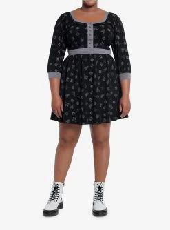 Hang up your heavy Kefta for something more casual and cute! From Shadow and Bone, this fit and flare dress features an allover print of various Grisha sigils. Comes with a sweetheart neckline, faux buttons at the bust and 3/4 sleeves. Complete with a contrast elasticated waistband and side seam pockets.