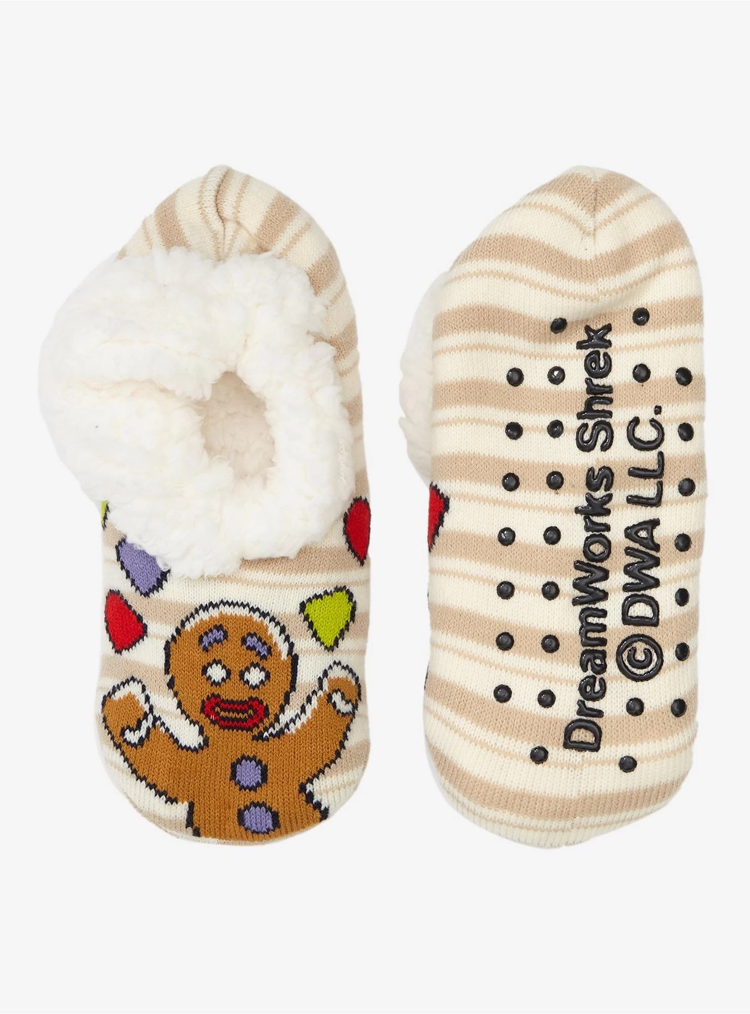 Get cozy with your Shrek fave! Featuring a striped design, depicting Gingy with all the gumdrop buttons he could ask for. Comes with comfy sherpa lining and non-slip grips on the bottom.