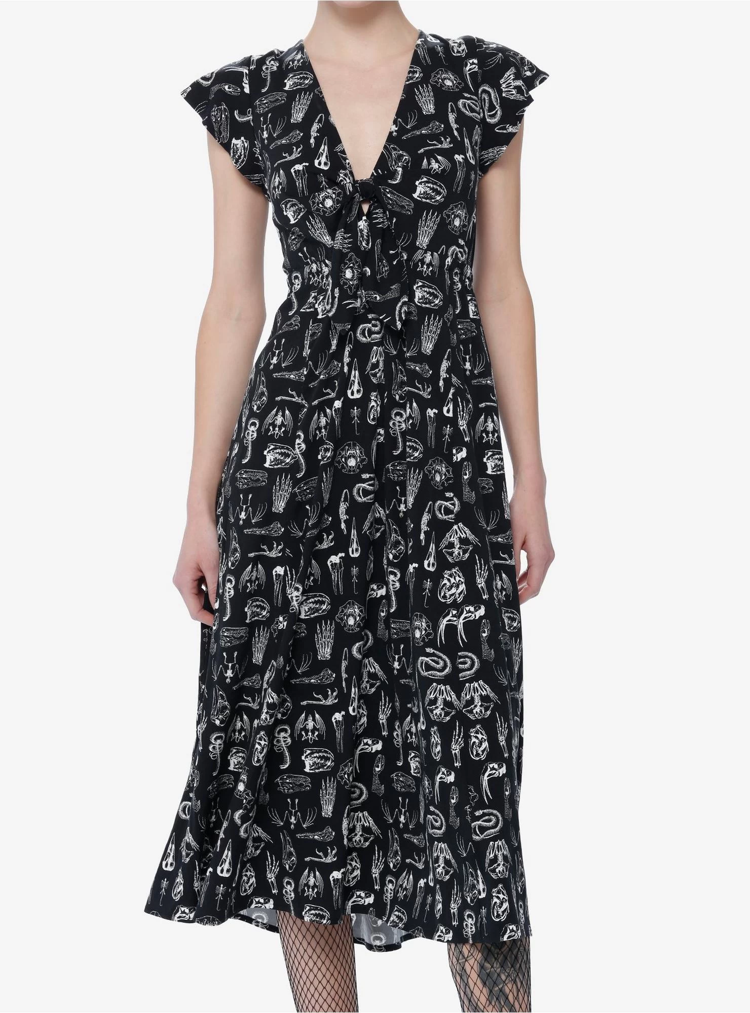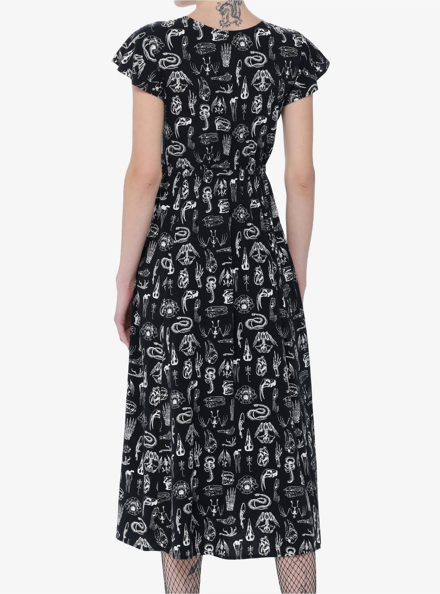 Get ready to add more skeletons in your closet with this midi dress! Perfect for lovers of animals and the macabre, this stretchy dress comes with an allover print of different animal anatomy. Comes with flutter sleeves, tie-front straps at the bust and pockets.