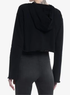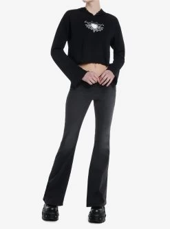 Keep warm and cozy in this stylish hoodie! It has a cropped fit and features a heart printed on the chest, surrounded by filigree. Complete with lace trimming on the hood and a lettuce hem.