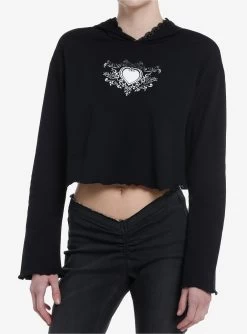 Keep warm and cozy in this stylish hoodie! It has a cropped fit and features a heart printed on the chest, surrounded by filigree. Complete with lace trimming on the hood and a lettuce hem.