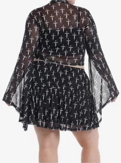 Sharpen your look with this dramatic top from Social Collision. It has large bell sleeves, a mock neck and mesh overlay printed with white daggers. It comes with a cami underneath.