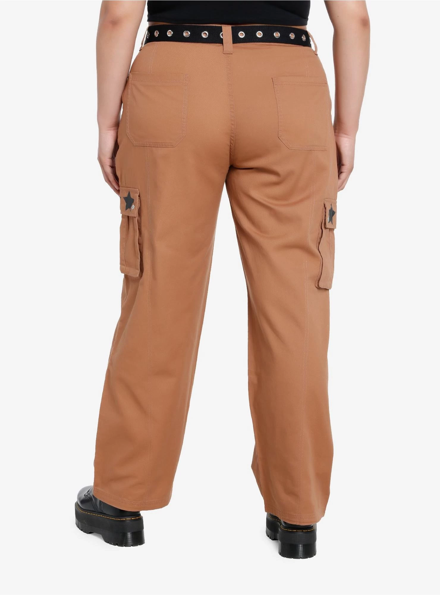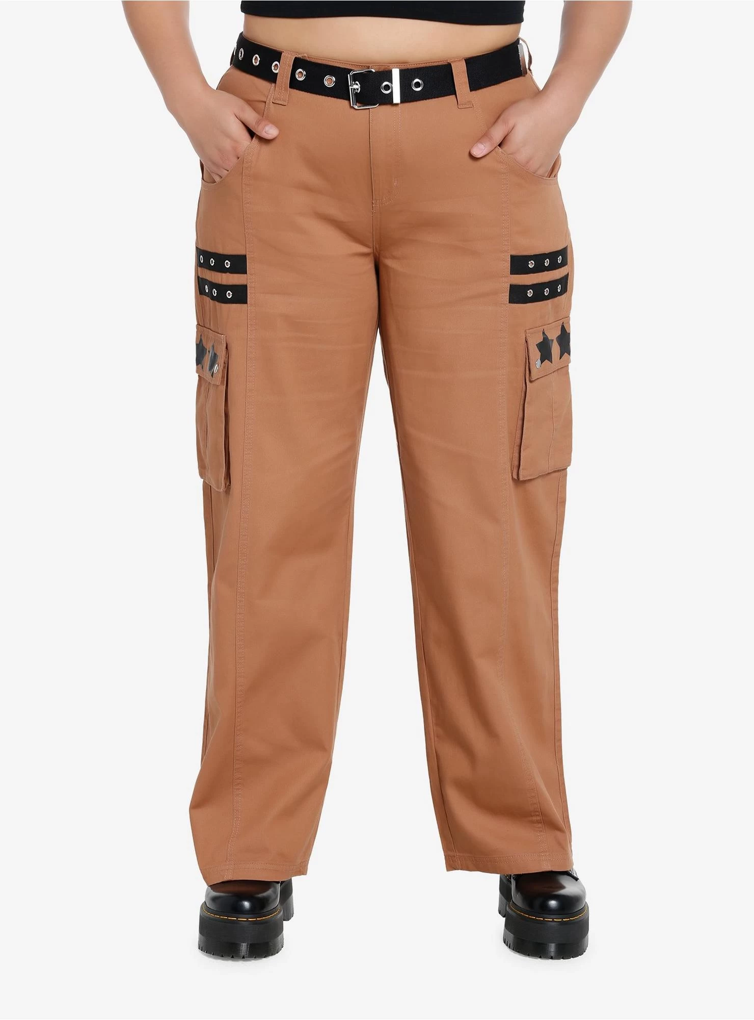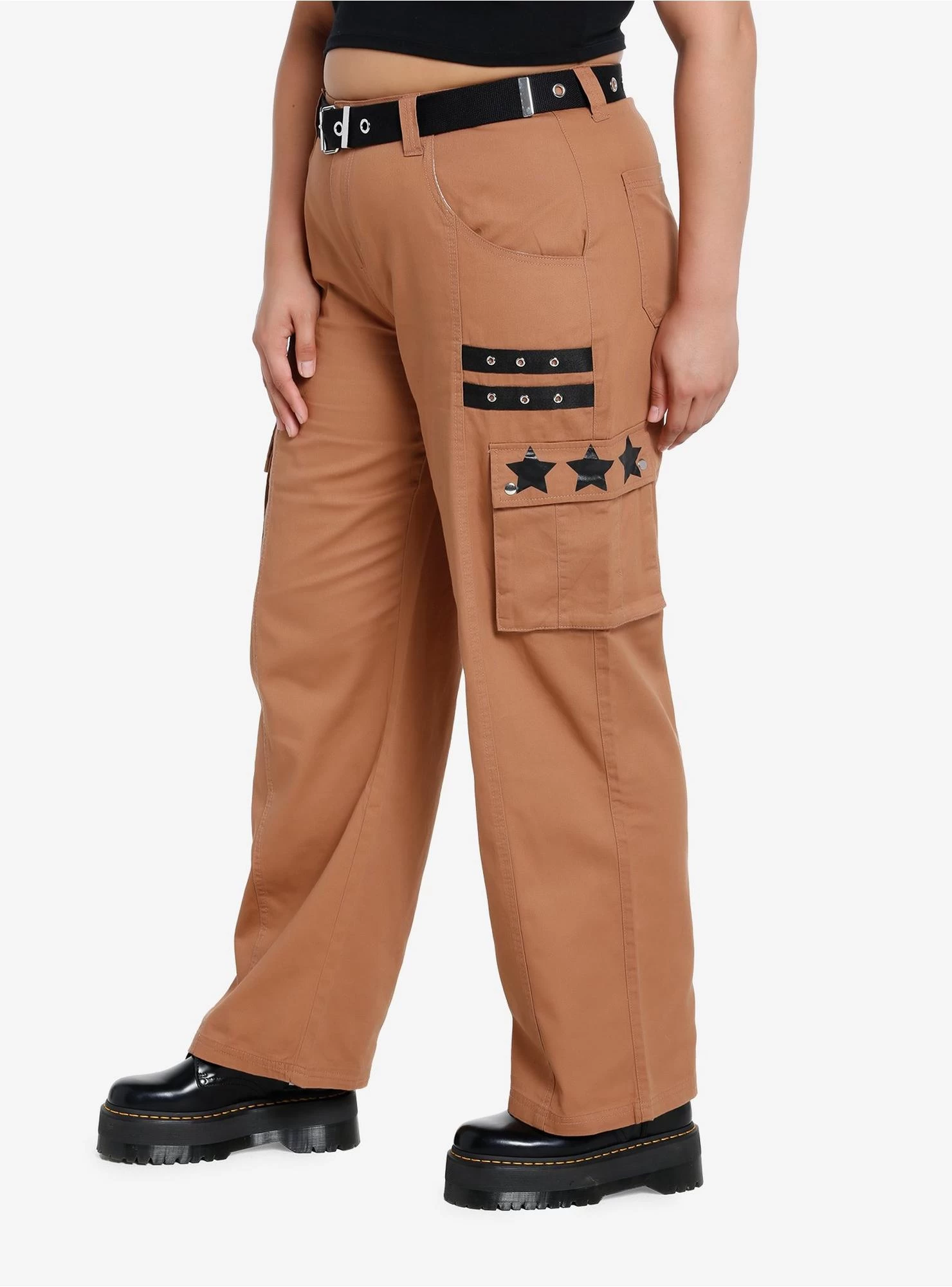 Want to lighten up your pants rotation for spring and summer, but still keep that edge? Try these brown straight-leg cargo pants with black grommet taping, a removable belt and black stars printed on the cargo pocket flaps.