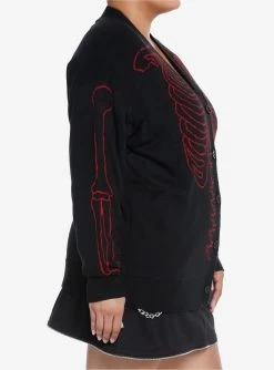 Keep yourself cozy on bone-chilling days! This black knit cardigan has red rib cage details knit on the front and bones on the sleeves. Comes with center buttons.