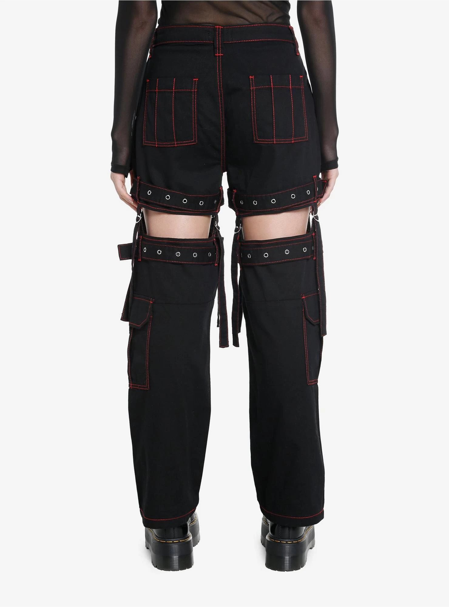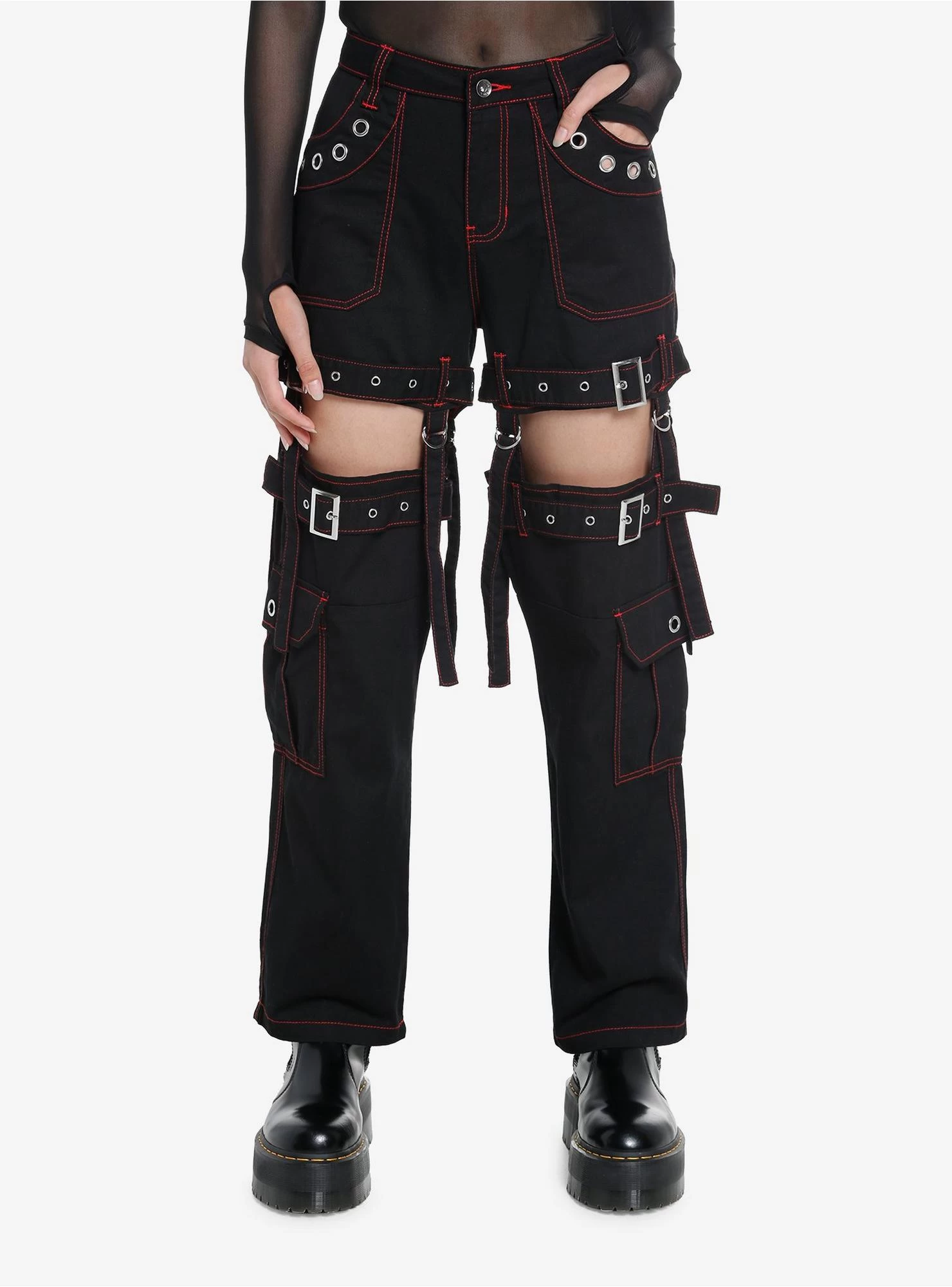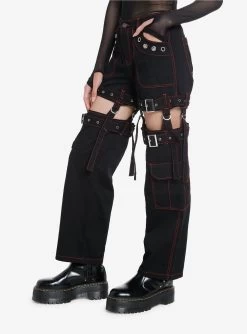 Dress like a true baddie in these black carpenter pants! Featuring cutout detailing around the thigh attached by garters. Comes with red contrast stitching throughout with grommet and buckle detailing. Comes with cargo, hip and back pockets.