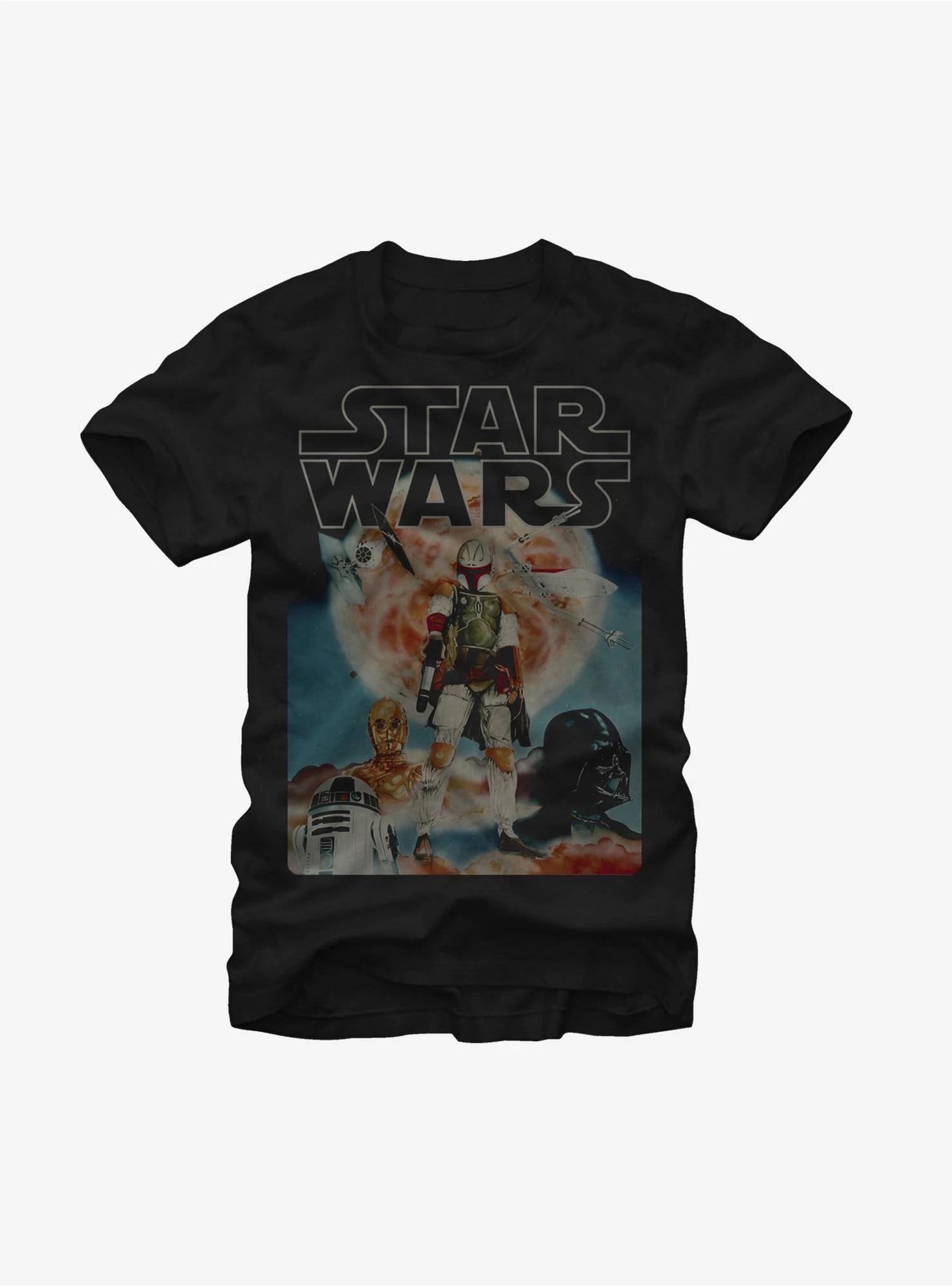 You don’t have to go to a galaxy far, far away to get your hands on the Star Wars Boba Fett and Droids Black T-Shirt! A vintage style print on the front of this durable black tee features Boba Fett, C-3PO, R2-D2, and Darth Vader below the Star Wars logo. 100% Cotton.