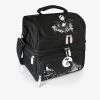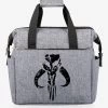 An insulated lunch cooler is perfect for a meal on the go. Features durable polyester construction with isolated sections for hot and cold foods and Darth Vader artwork on the front. Adjustable shoulder strap and soft grip handle offer transport options; Zippered mesh pockets on the sides for extras.