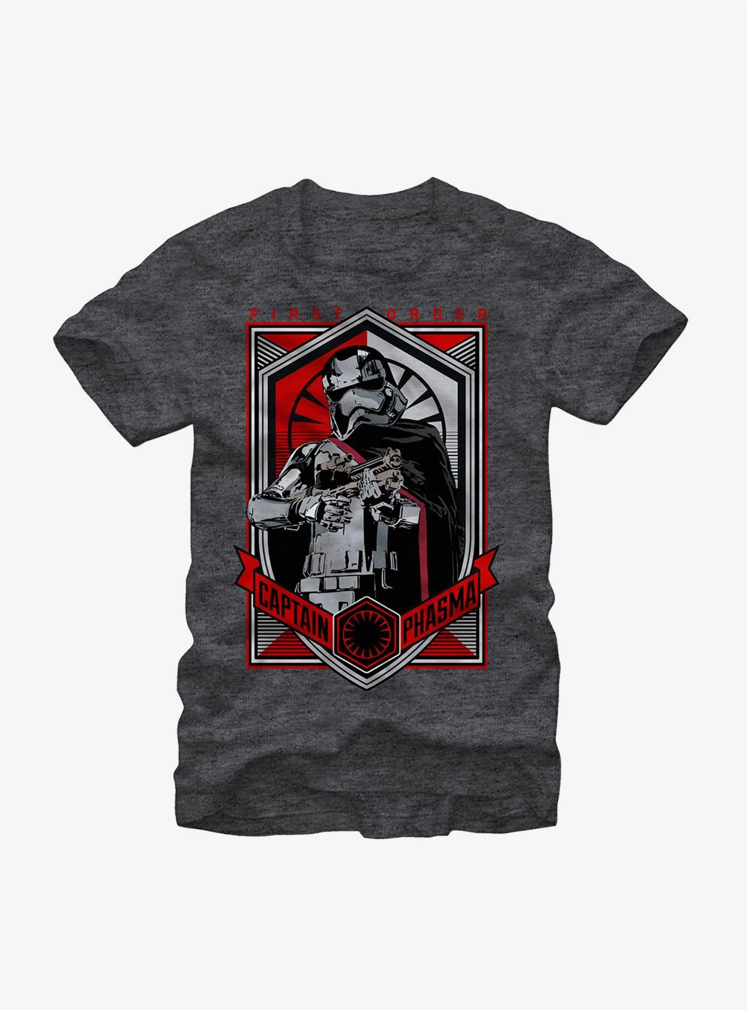 When standard stormtroopers just aren’t enough, take your wardrobe to the top of the ranks with the Star Wars First Order Captain Phasma Heather Charcoal T-Shirt. This charcoal gray shirt features a black, gray, and red print that reads “First Order Captain Phasma” next to Captain Phasma. 60% Cotton, 40% Polyester.