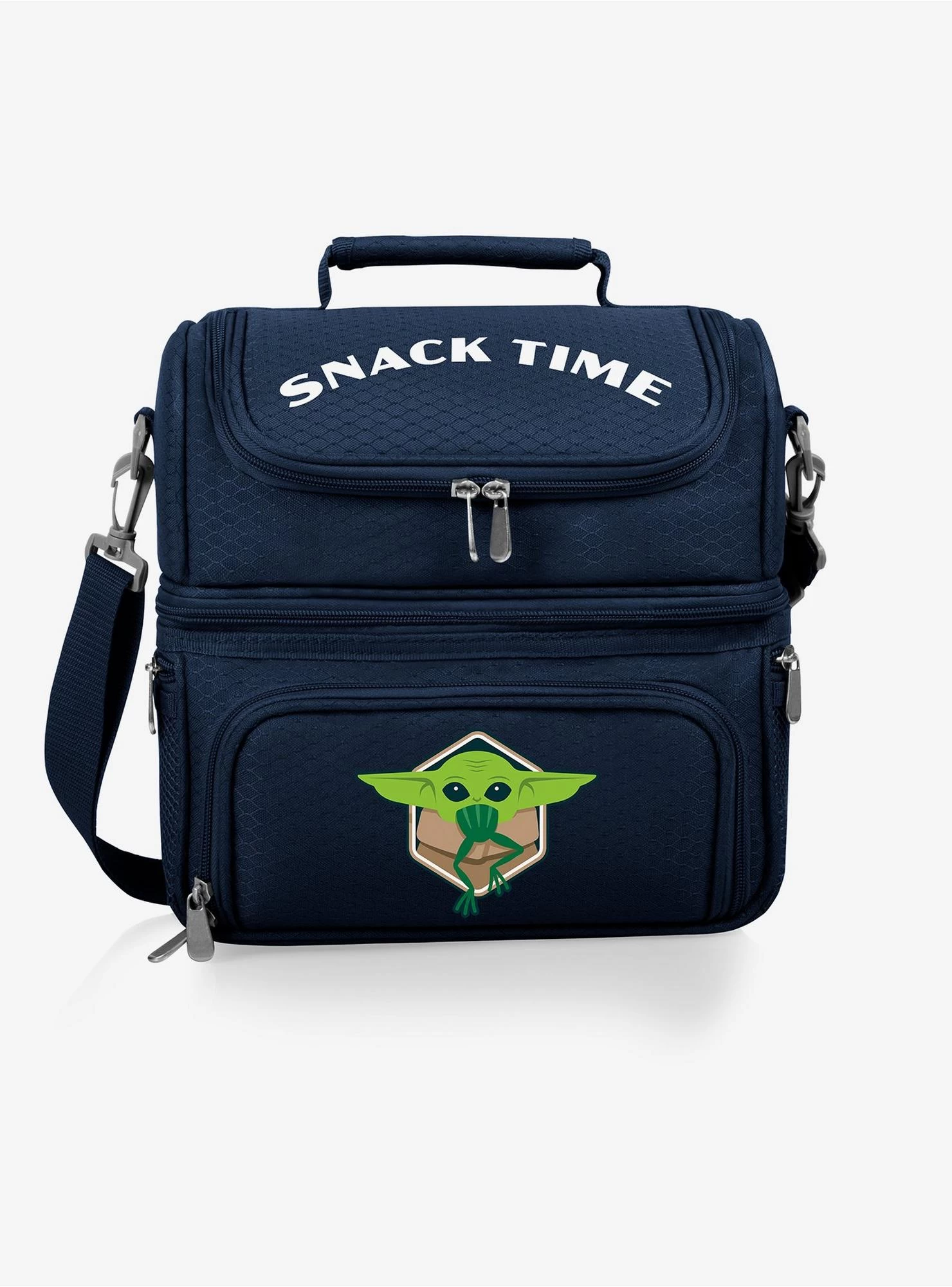 Cute up your lunch box game with the Star Wars The Child Pranzo Lunch Tote. Insulated with separate hot and cold compartments with an 8-can capacity, and includes a napkin, flatware, and salt and pepper shakers. This lunch tote also features zippered side mesh pockets on each side, a hidden flatware section, adjustable shoulder strap and a soft grip top handle.