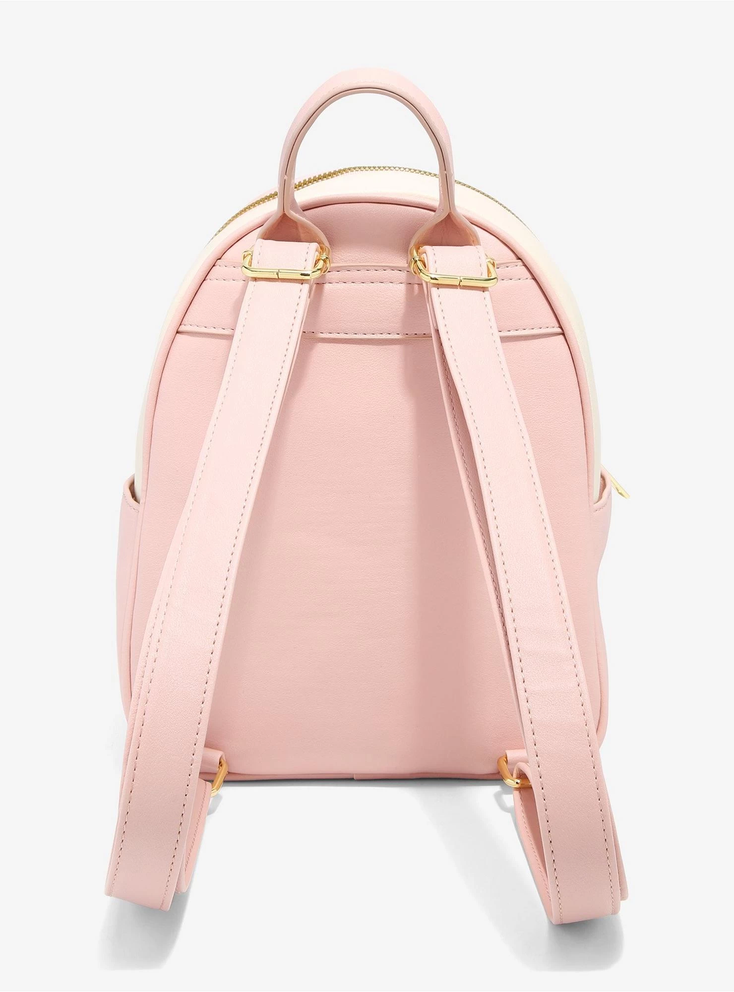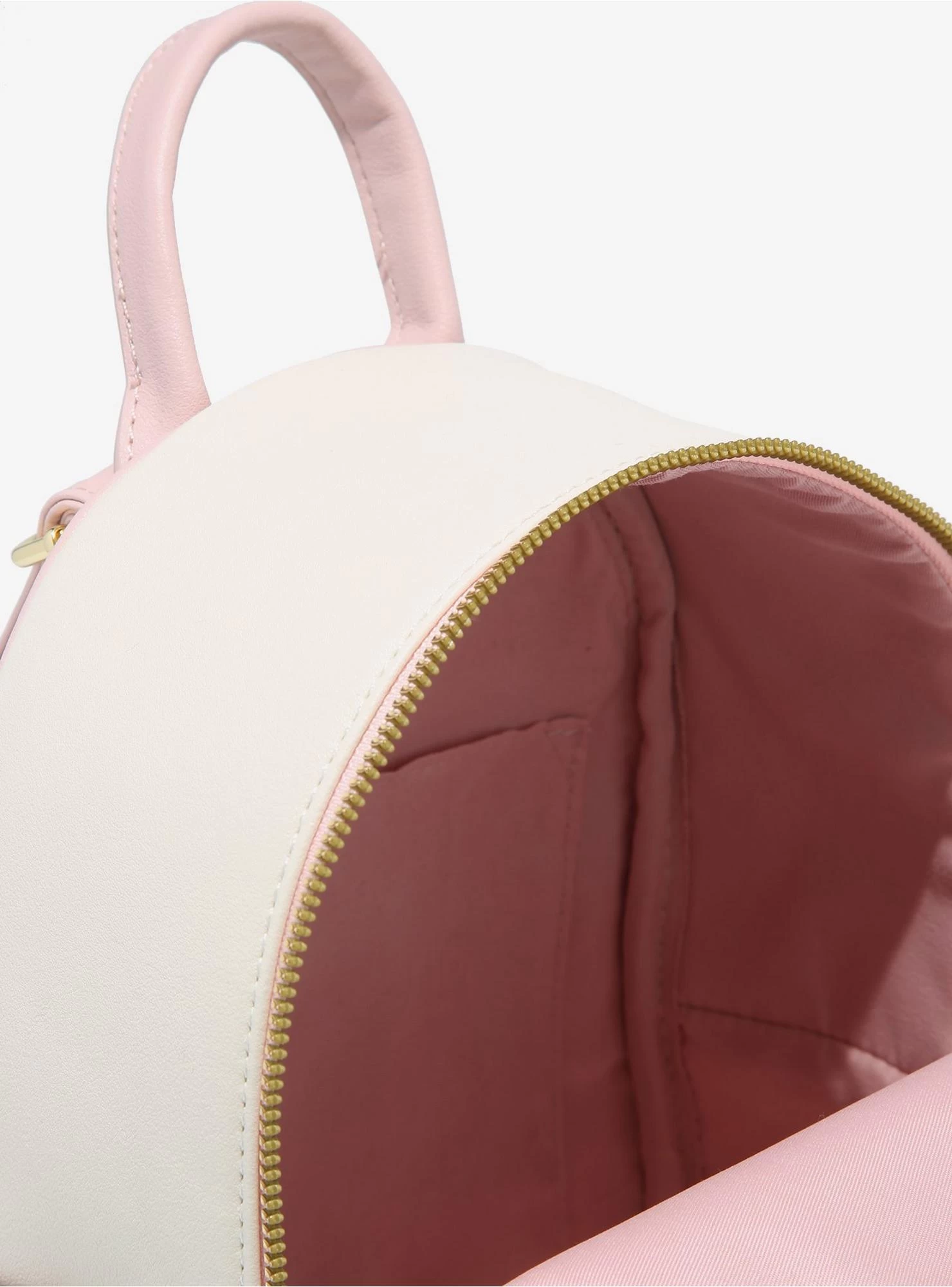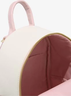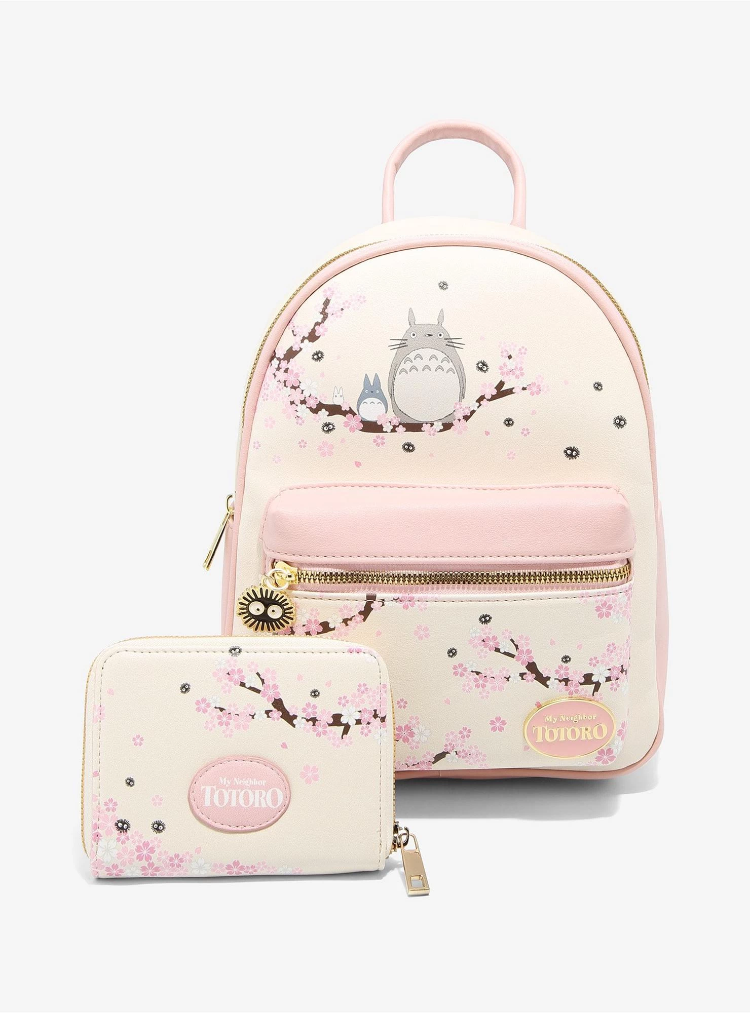 Take some friendly forest spirits with you wherever you go with this mini backpack! From My Neighbor Totoro, this cream backpack features Totoros and Soot Sprites resting among sakura branches. The front pocket comes with a Soot Sprite zipper charm. Finished off with side pockets, gold-tone hardware and interior drop pocket.