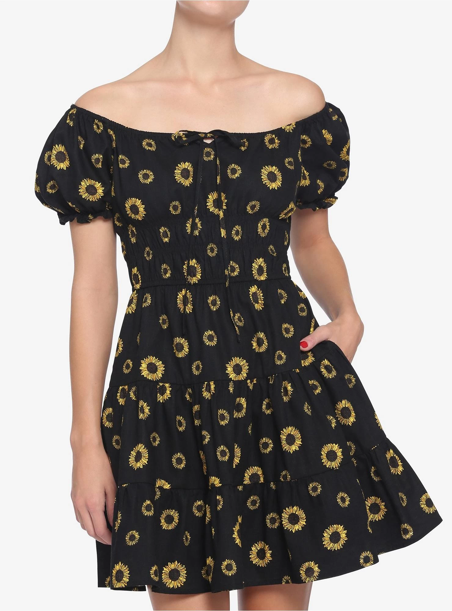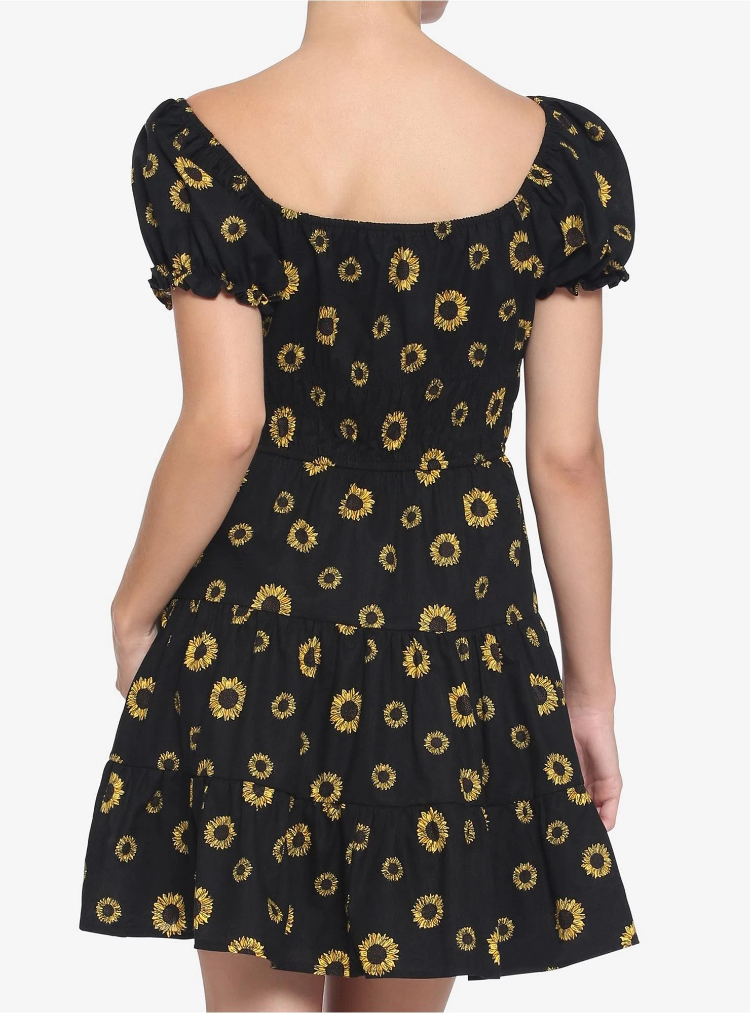 Look as radiant as a sunflower with this tiered smock dress! Both comfy and cute, this black dress has an allover print of sunflowers with smocked detail under the chest, tiered stitching at the bottom and puffed sleeves.