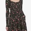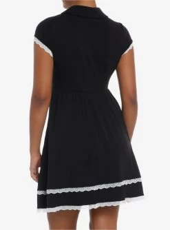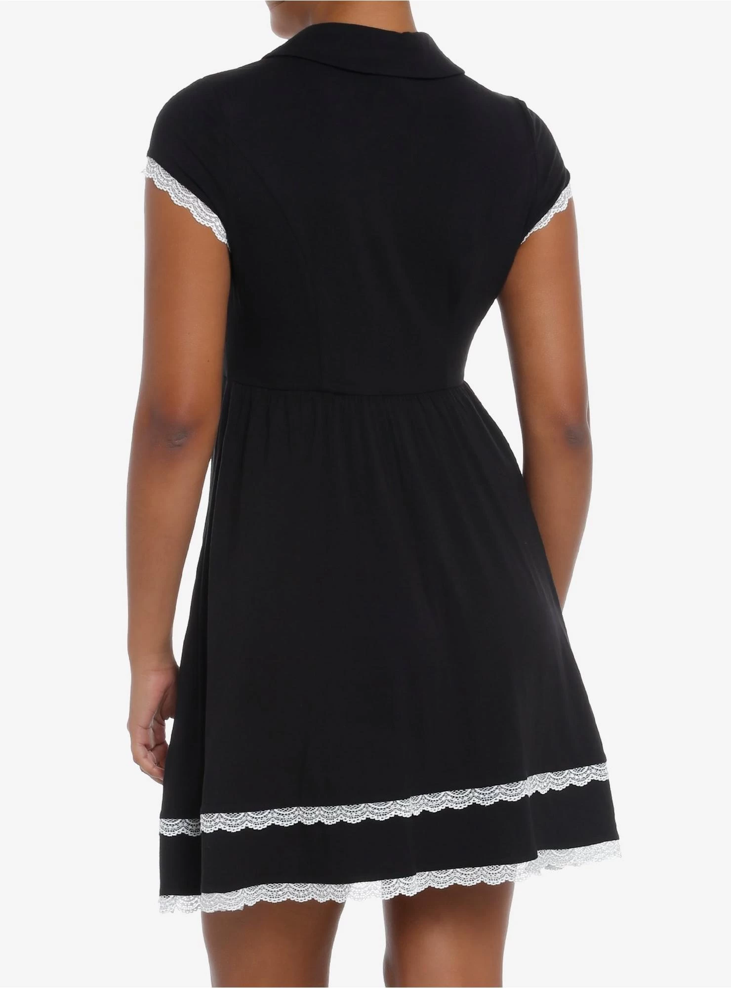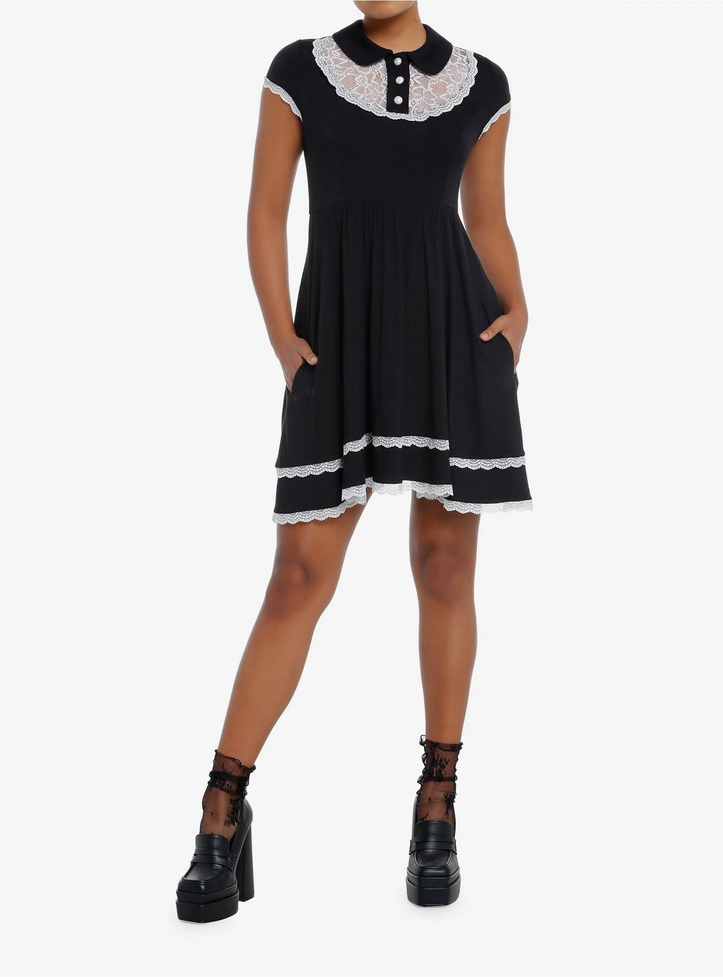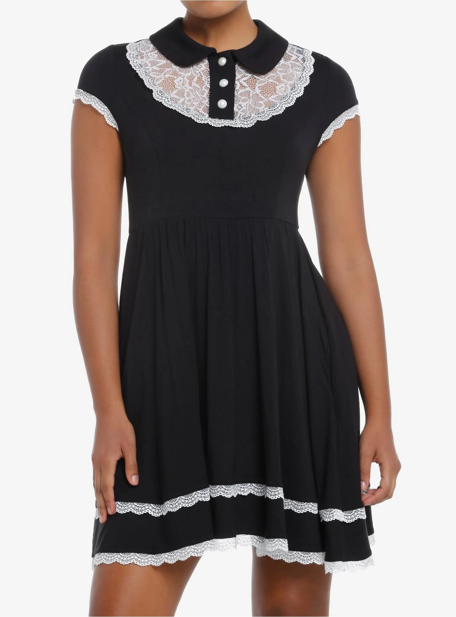 This dreamy dress was made for reading books under a tree. It’s black with white lace detailing, from the sleeves to the bottom hem. The front has a white lace bib with faux pearl buttons, and a sweetheart collar. This dress also has pockets!