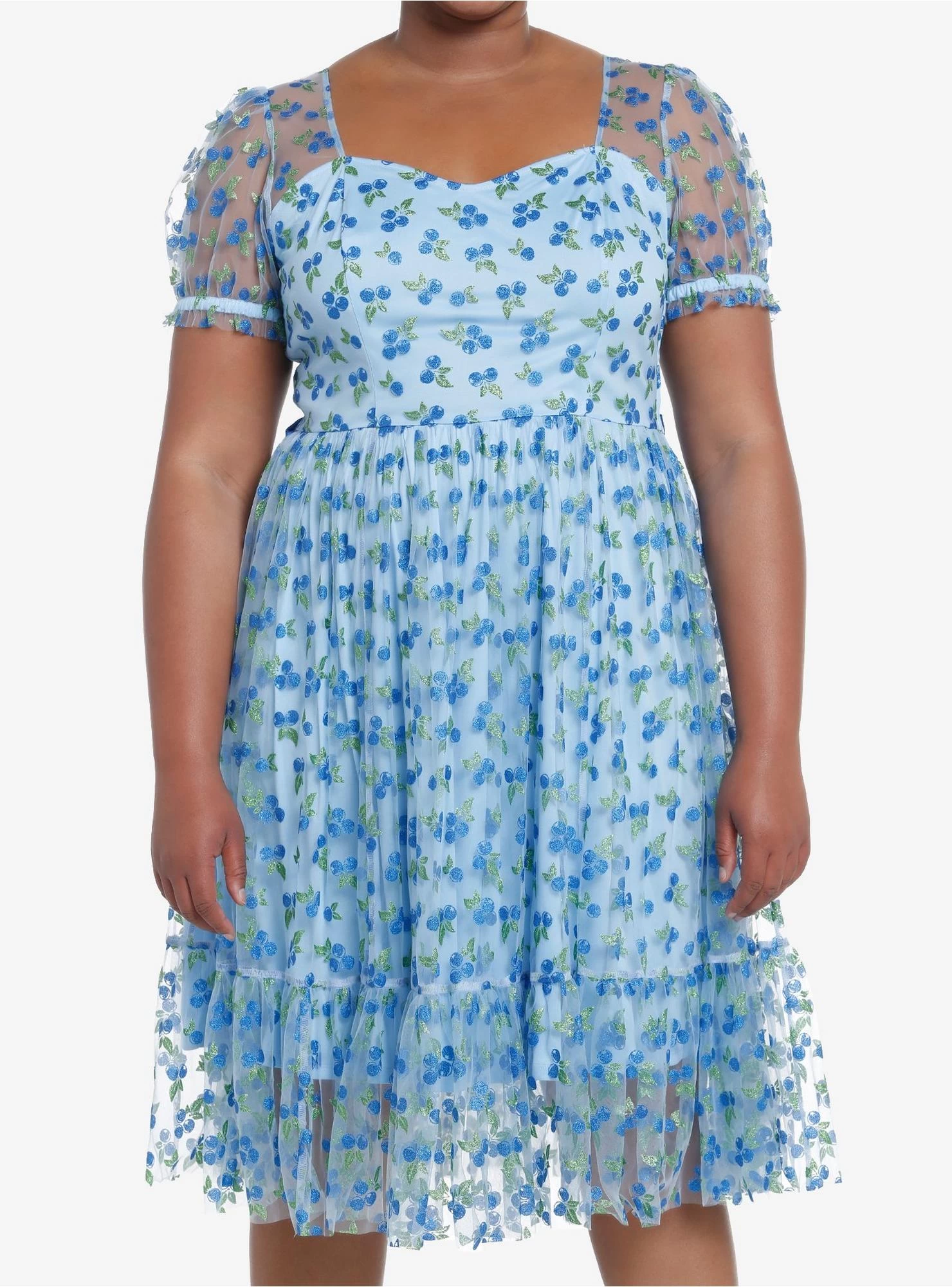 Twirl your way into spring looking your berry best! This sweet dress features a tulle overlay with an allover glitter blueberry pattern. Comes with puff sleeves, a back ribbon tie and a side zipper closure.