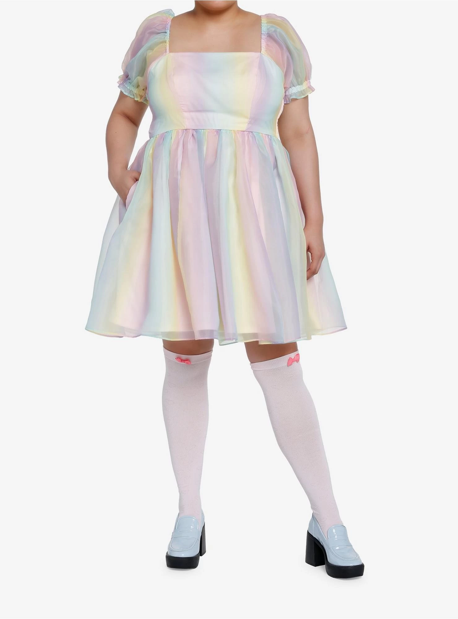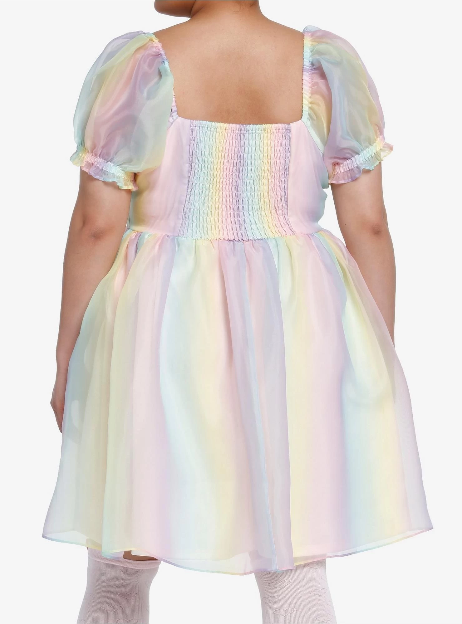 Add something dreamy to your dress rotation! Twirl and twirl in this pastel rainbow tiered organza dress, featuring a puffed tier skirt, princess seams at the bust and elasticated puffy sleeves. Comes with pockets and side zipper.